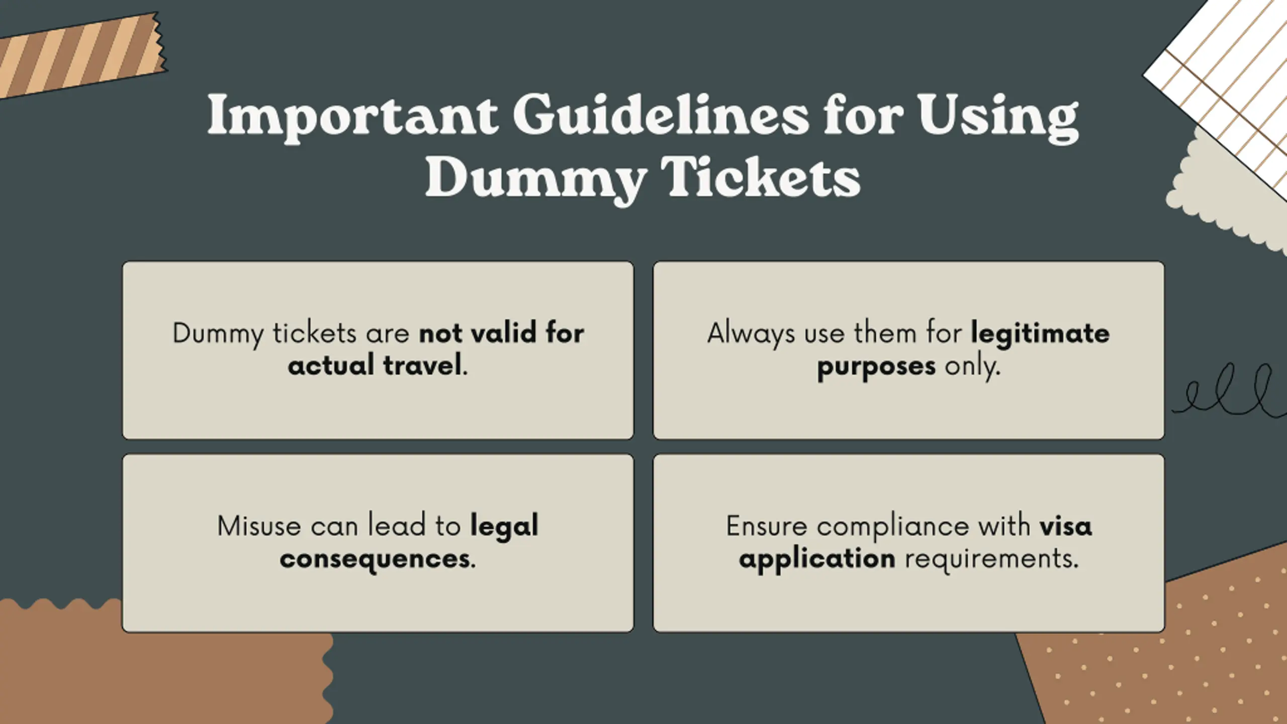 Important Guidelines for Using Dummy Tickets Dummy tickets are not valid for actual travel. Always use them for legitimate purposes only. Misuse can lead to legal consequences. Ensure compliance with visa application requirements.
