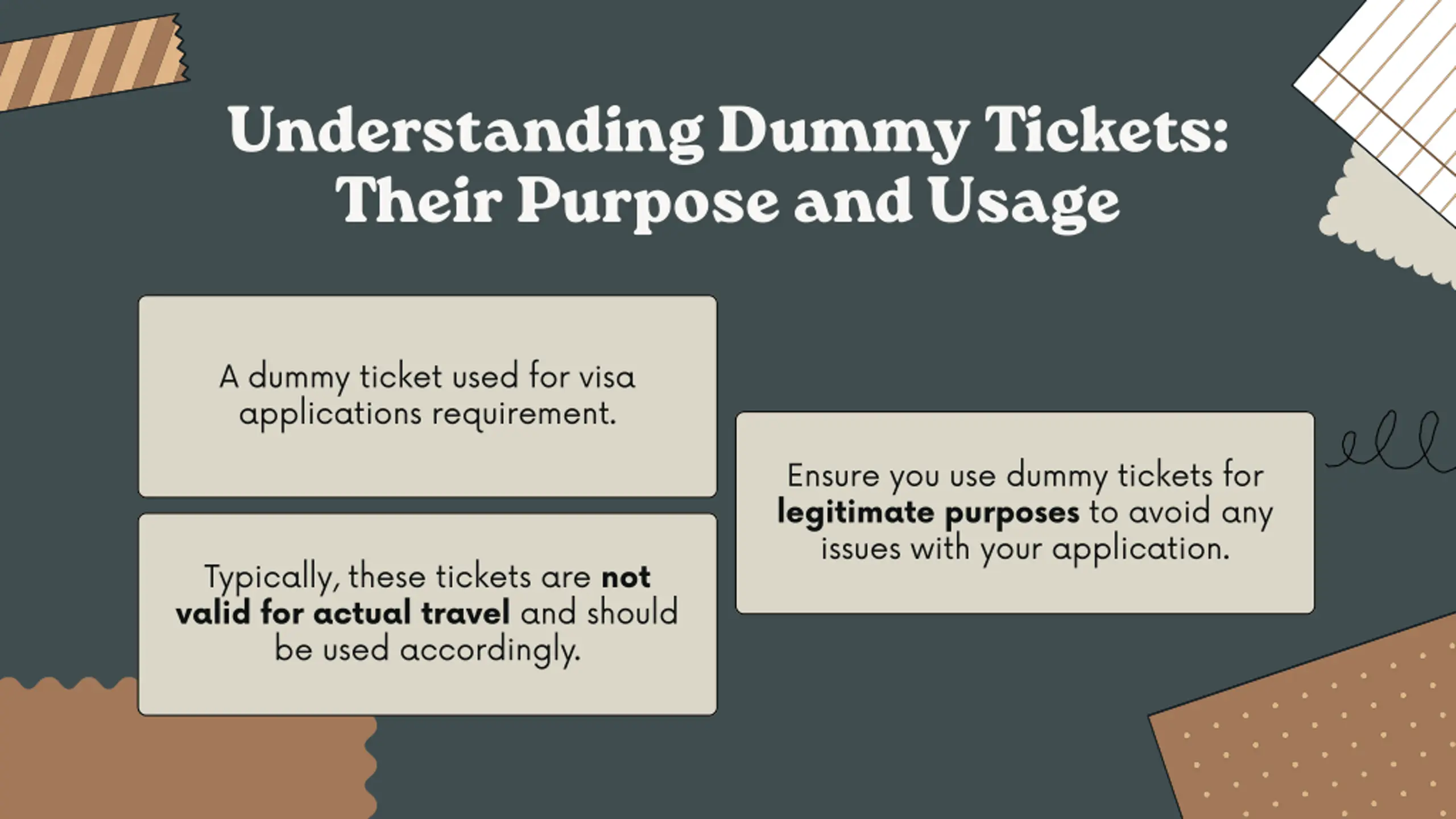 Understanding Dummy Tickets: Their Purpose and Usage A dummy ticket used for visa applications requirement. Ensure you use dummy tickets for legitimate purposes to avoid any issues with your application. Typically, these tickets are not valid for actual travel and should be used accordingly.