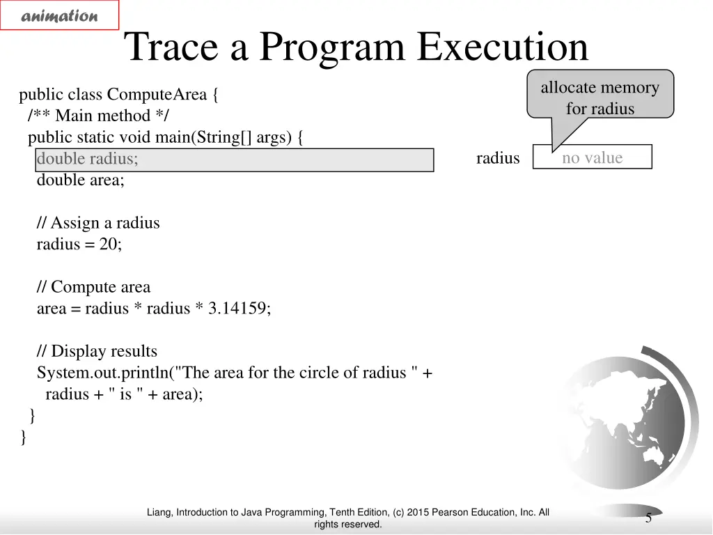 Introducing Programming with an Example Listing 2.1 Computing the Area of a Circle This program computes the area of the circle. Animation ComputeArea Animation Run Run Liang, Introduction to Java Programming, Tenth Edition, (c) 2015 Pearson Education, Inc. All rights reserved. 4