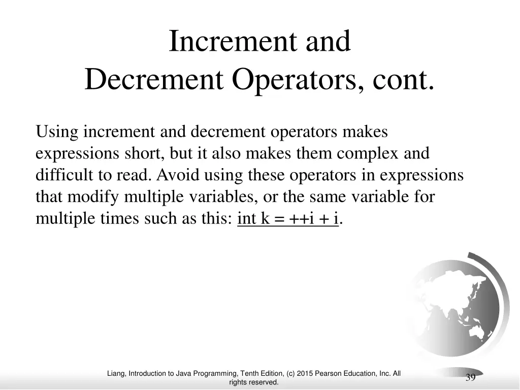 Increment and Decrement Operators, cont. Using increment and decrement operators makes expressions short, but it also makes them complex and difficult to read. Avoid using these operators in expressions that modify multiple variables, or the same variable for multiple times such as this: int k = ++i + i. Liang, Introduction to Java Programming, Tenth Edition, (c) 2015 Pearson Education, Inc. All rights reserved. 39