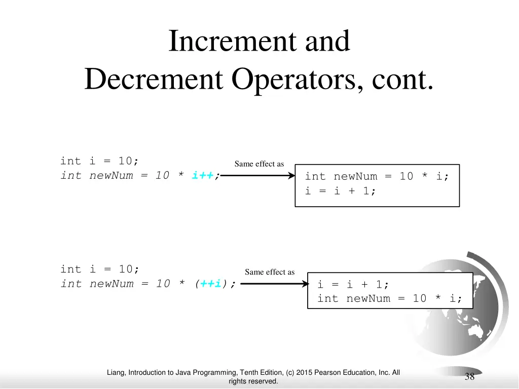 Increment and Decrement Operators Liang, Introduction to Java Programming, Tenth Edition, (c) 2015 Pearson Education, Inc. All rights reserved. 37