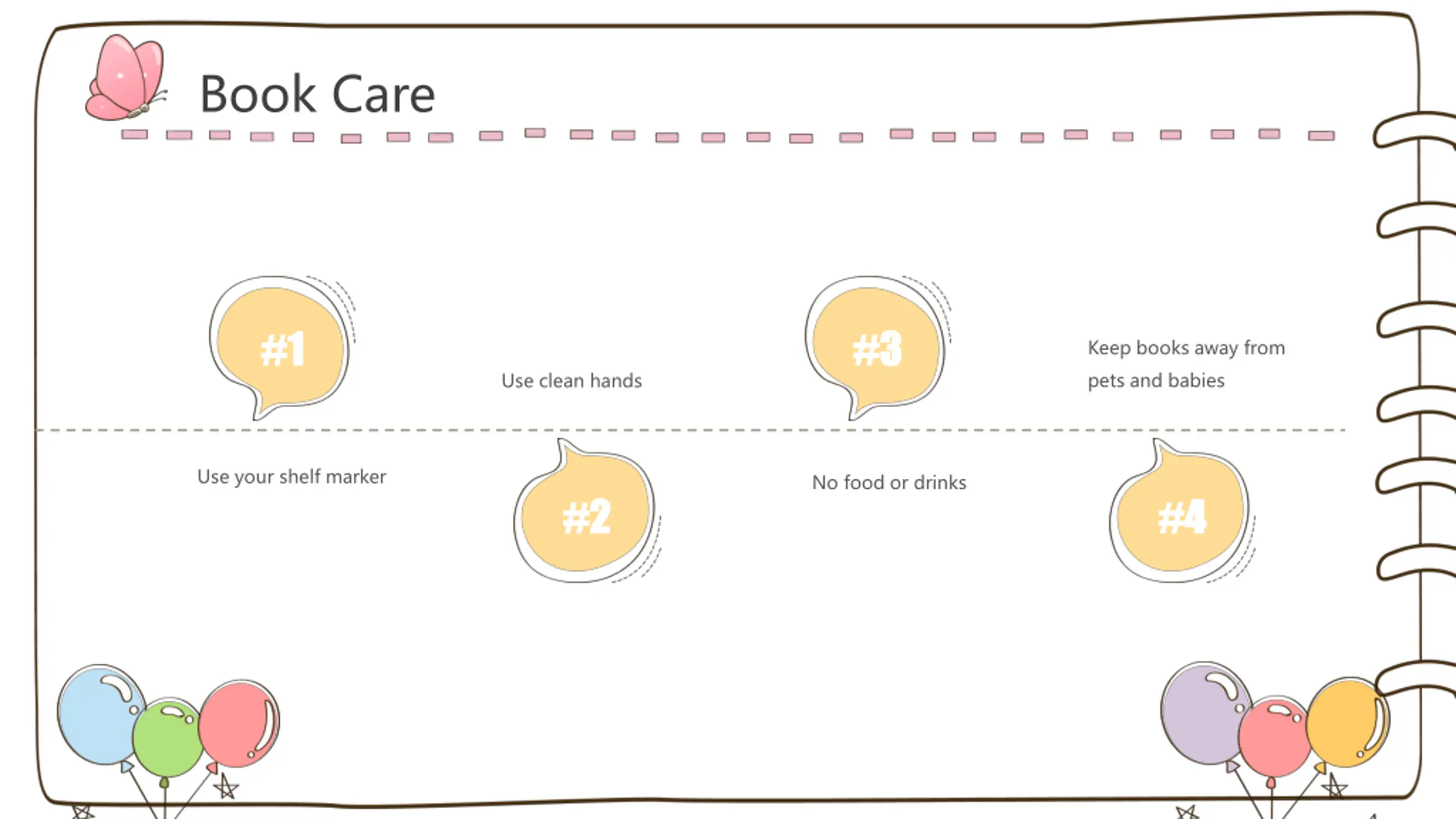 Book Care #1 #1 #3 #3 Keep books away from pets and babies Use clean hands Use your shelf marker No food or drinks #2 #2 #4 #4