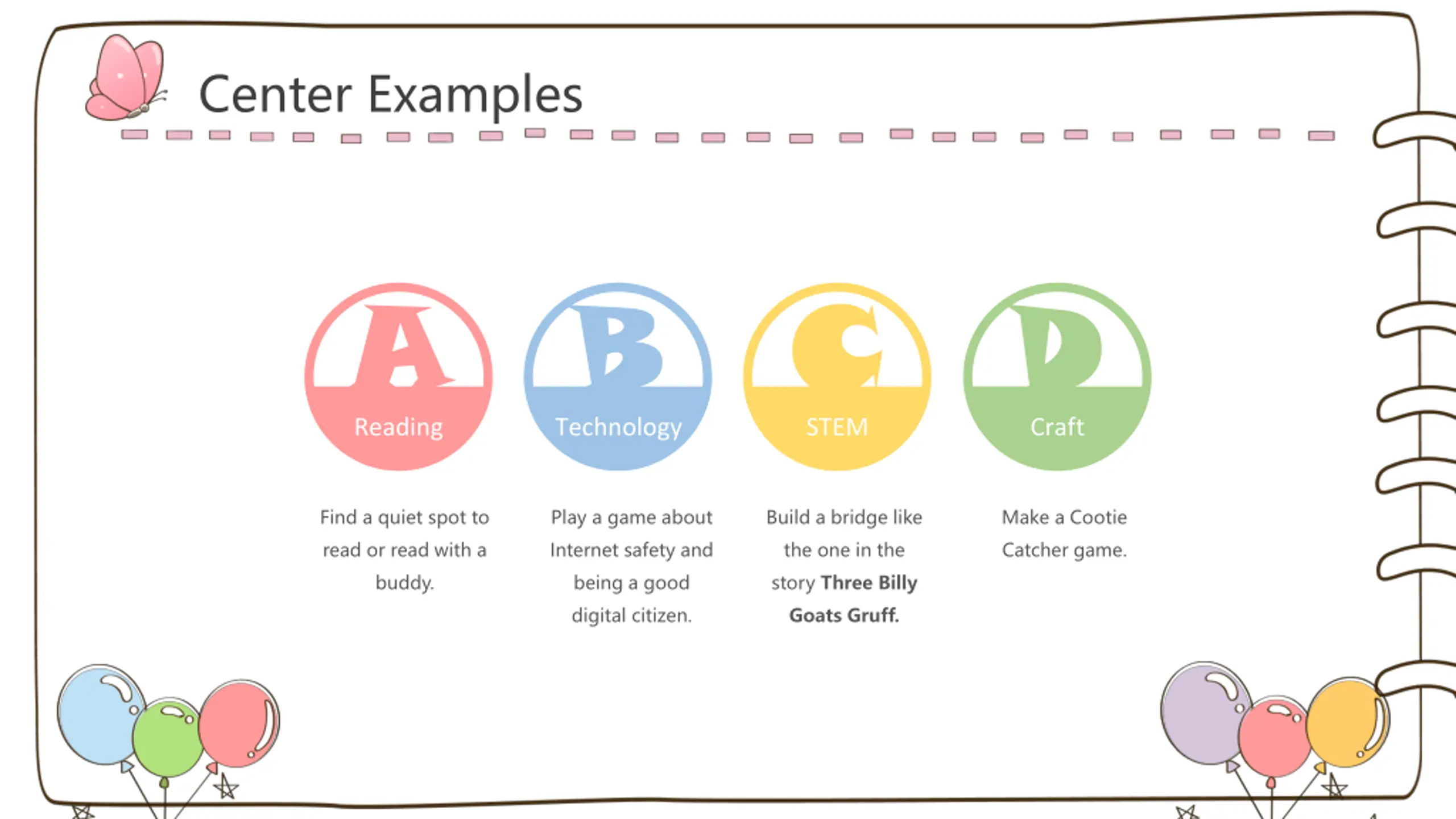 Center Examples A Reading B Technology C STEM D Craft Find a quiet spot to read or read with a buddy. Play a game about Internet safety and being a good digital citizen. Build a bridge like the one in the story Three Billy Goats Gruff. Make a Cootie Catcher game.