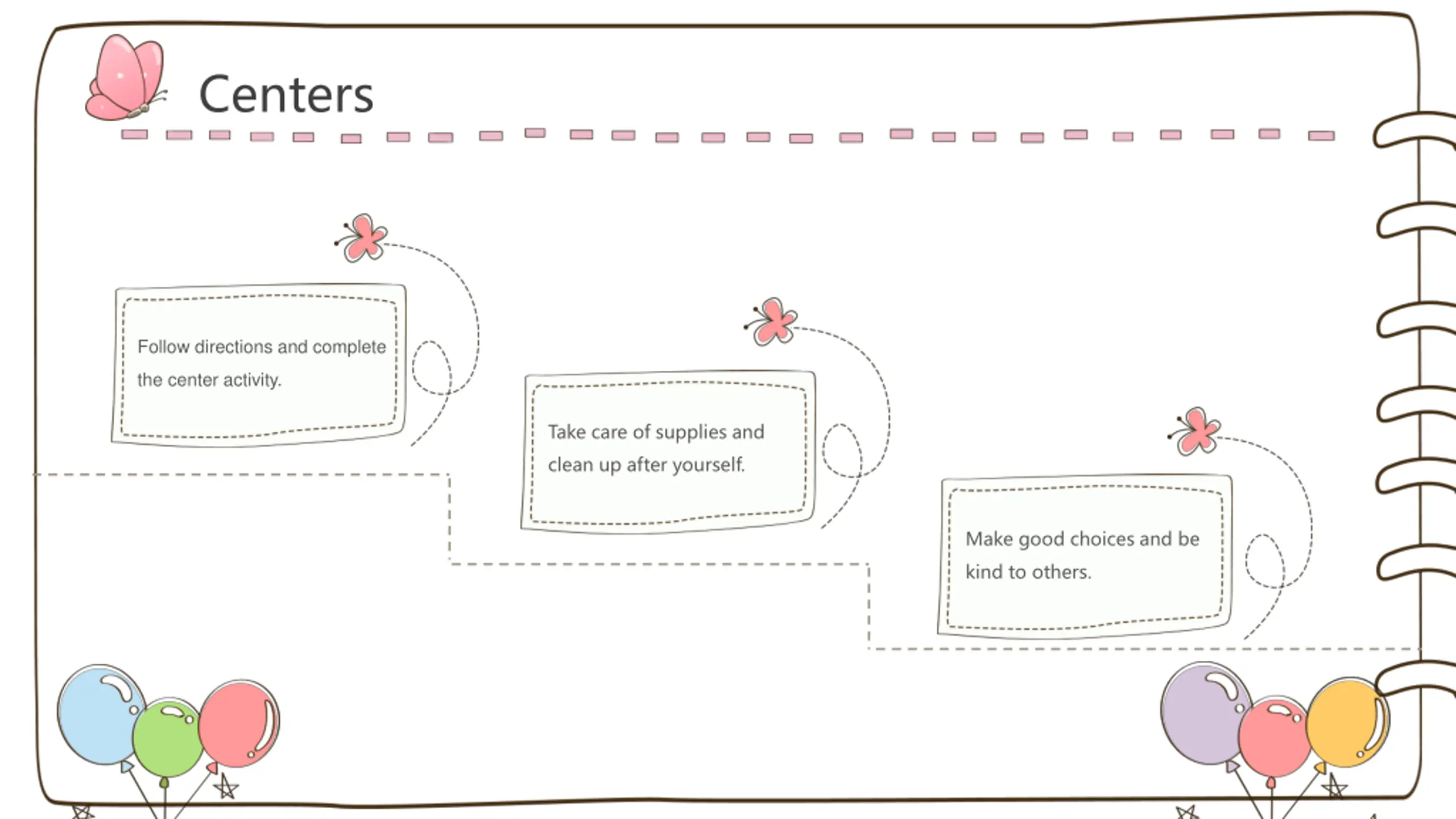 Centers Follow directions and complete the center activity. Take care of supplies and clean up after yourself. Make good choices and be kind to others.