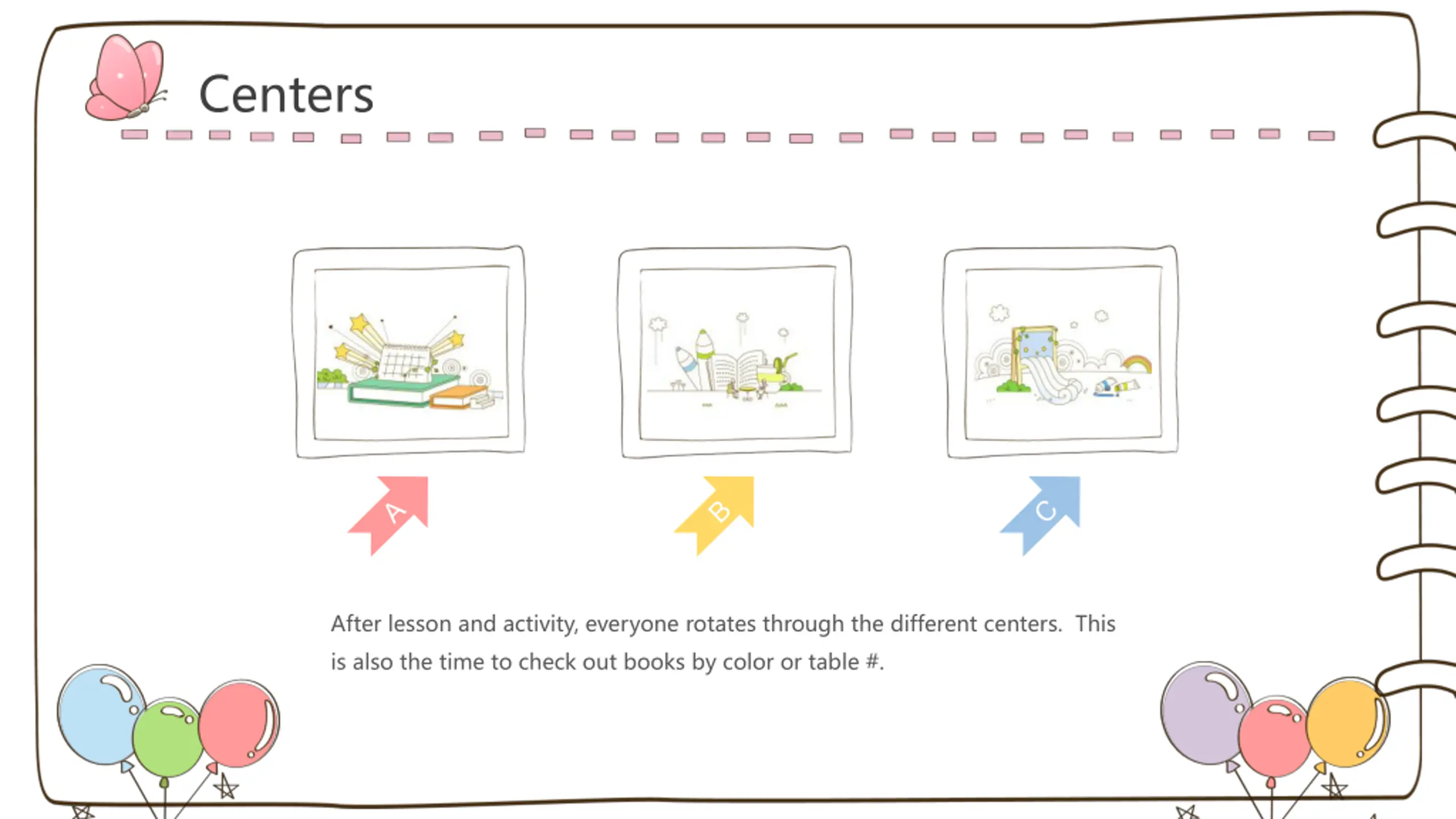 Centers After lesson and activity, everyone rotates through the different centers. This is also the time to check out books by color or table #.