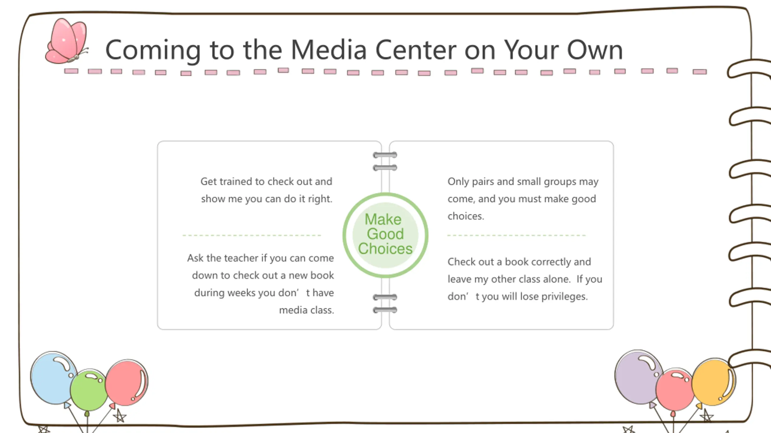 Coming to the Media Center on Your Own Get trained to check out and show me you can do it right. Only pairs and small groups may come, and you must make good choices. Make Good Choices Ask the teacher if you can come down to check out a new book during weeks you don t have Check out a book correctly and leave my other class alone. If you don t you will lose privileges. media class.