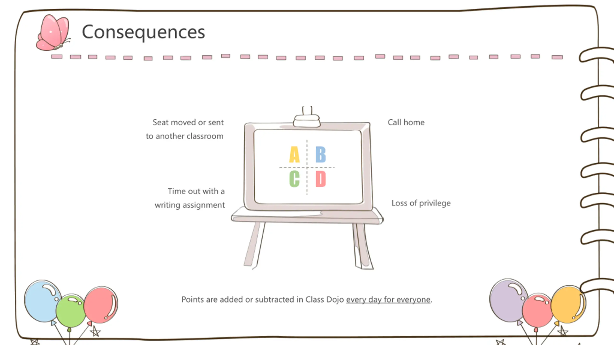 Consequences Seat moved or sent to another classroom Call home A B C D Time out with a writing assignment Loss of privilege Points are added or subtracted in Class Dojo every day for everyone.