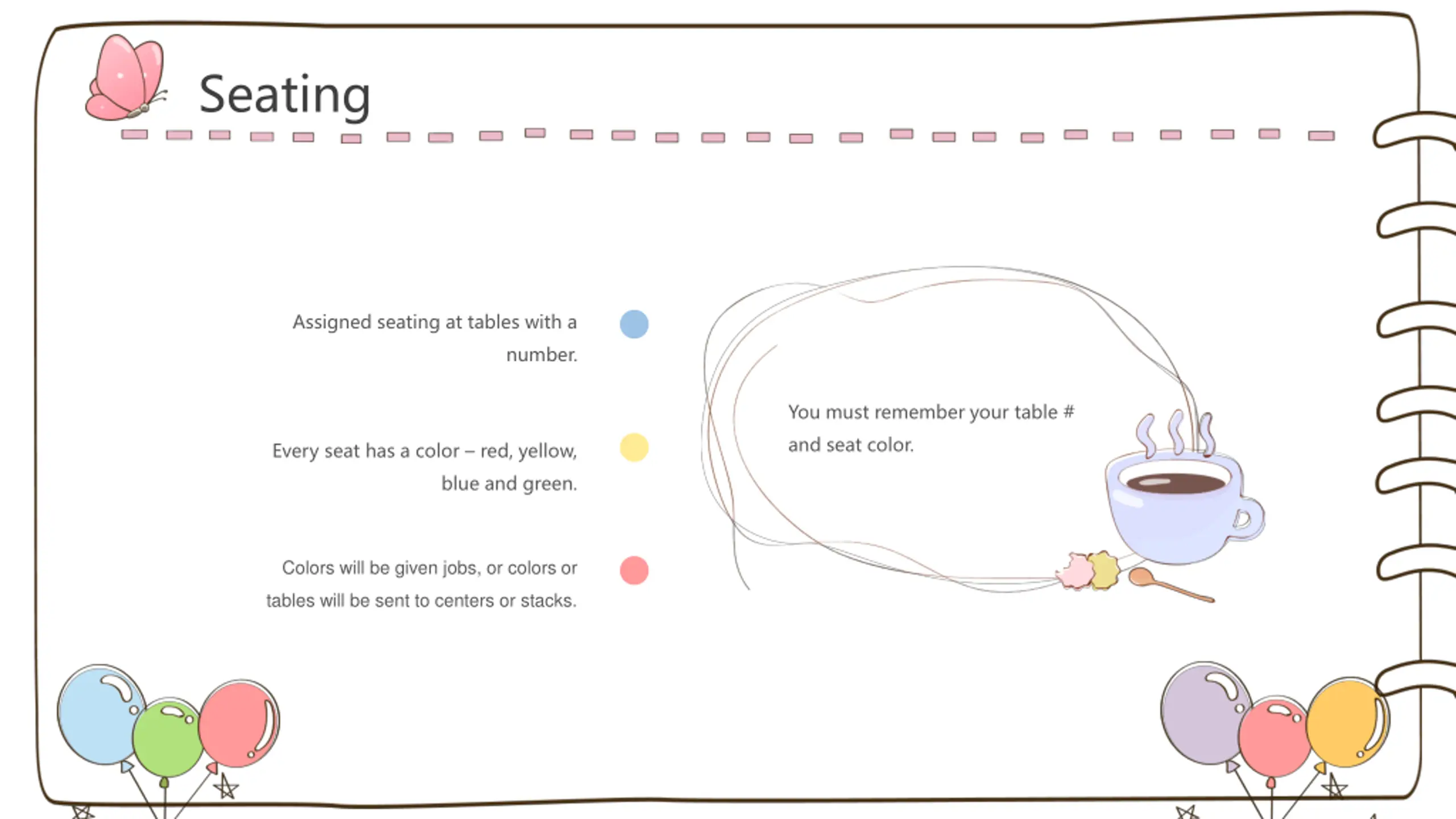 Seating Assigned seating at tables with a number. You must remember your table # and seat color. Every seat has a color red, yellow, blue and green. Colors will be given jobs, or colors or tables will be sent to centers or stacks.