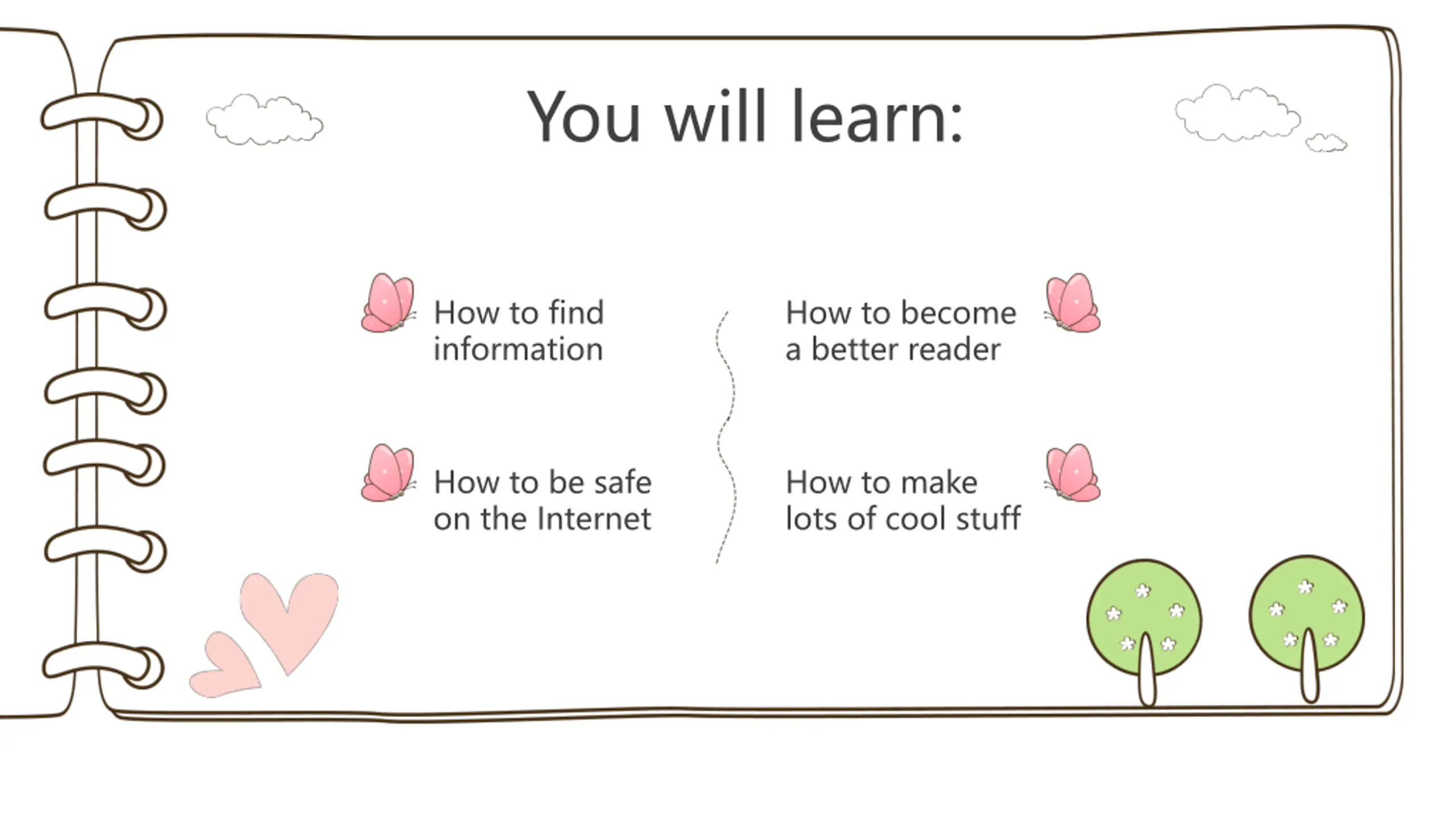 You will learn: How to find information How to become a better reader How to be safe on the Internet How to make lots of cool stuff