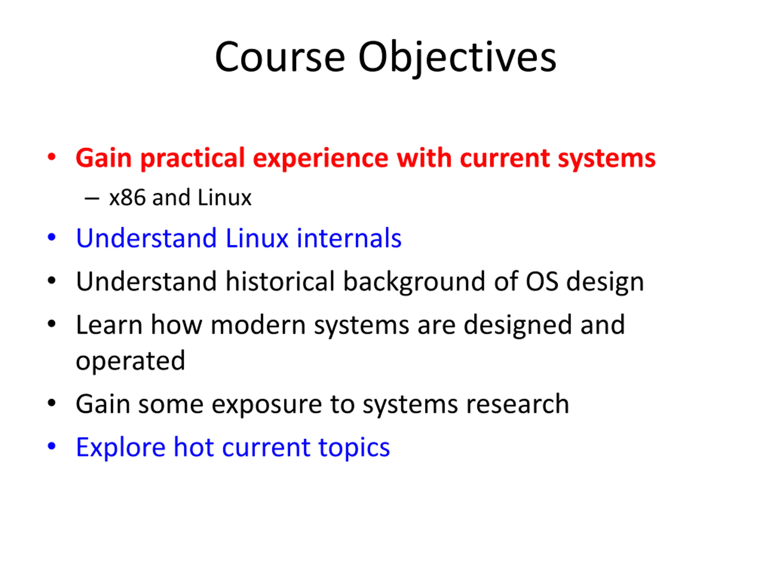 Course Objectives Gain practical experience with current systems x86 and Linux Understand Linux internals Understand historical background of OS design Learn how modern systems are designed and operated Gain some exposure to systems research Explore hot current topics