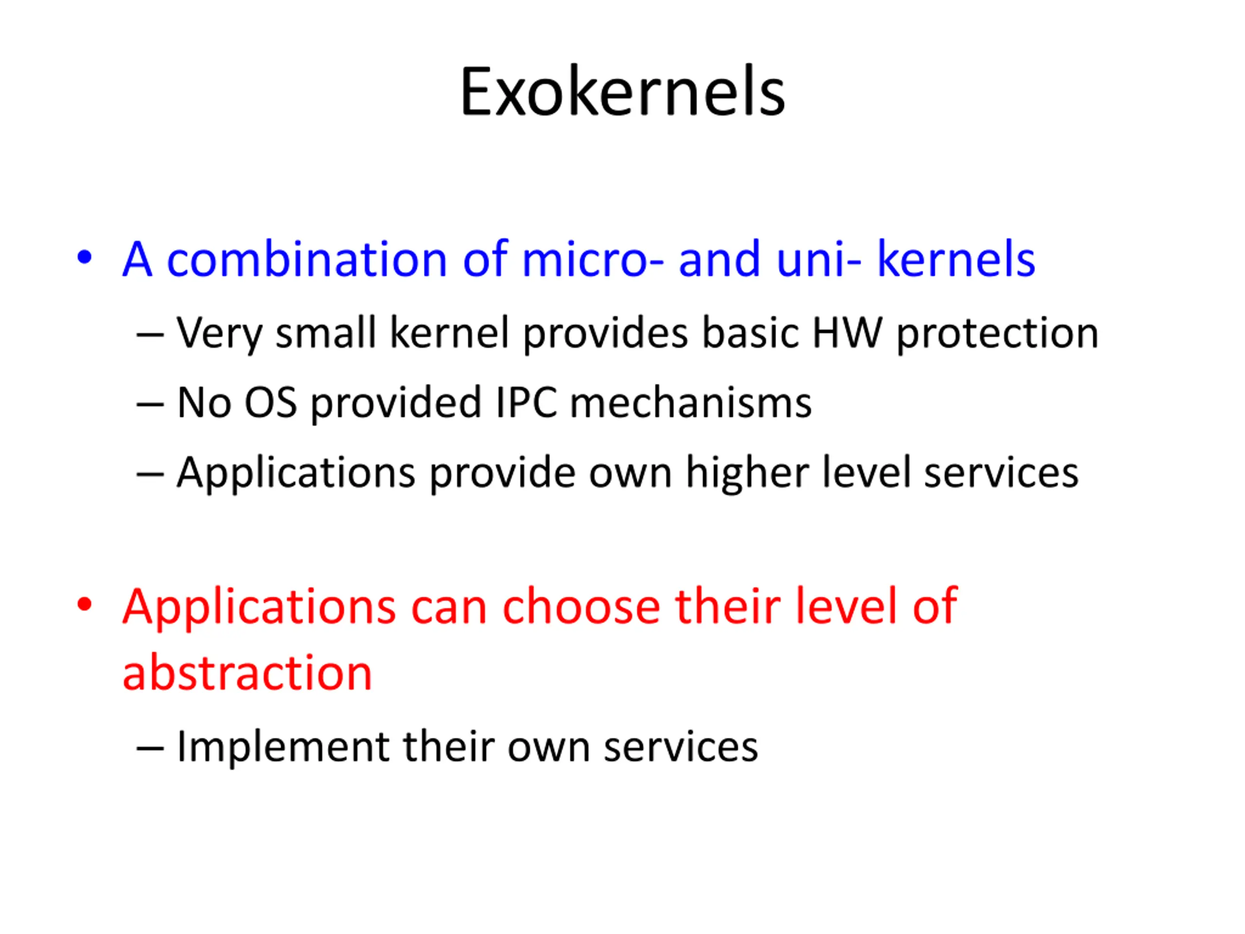 Exokernels A combination of micro- and uni- kernels Very small kernel provides basic HW protection No OS provided IPC mechanisms Applications provide own higher level services Applications can choose their level of abstraction Implement their own services