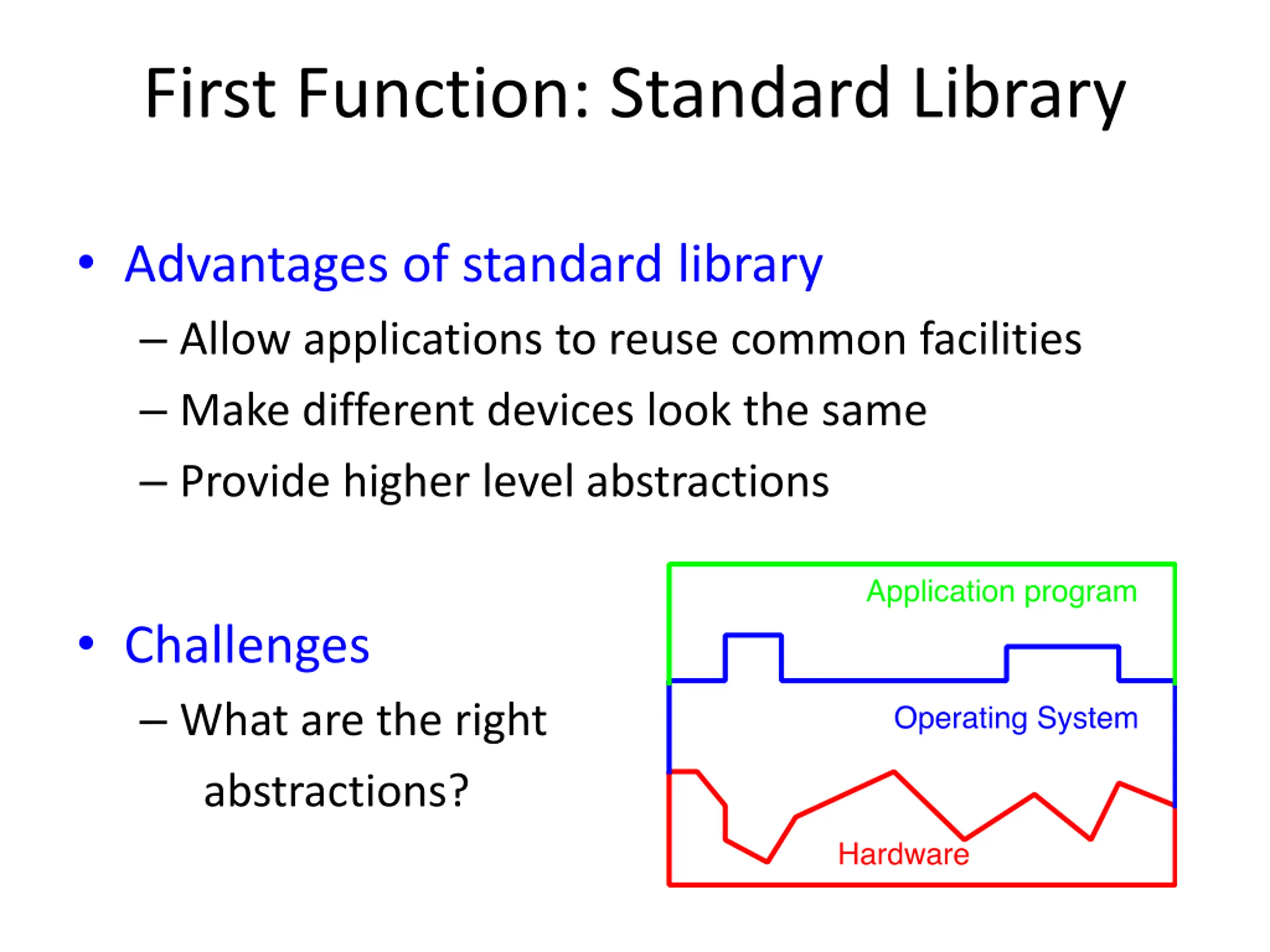 First Function: Standard Library Advantages of standard library Allow applications to reuse common facilities Make different devices look the same Provide higher level abstractions Challenges What are the right abstractions?