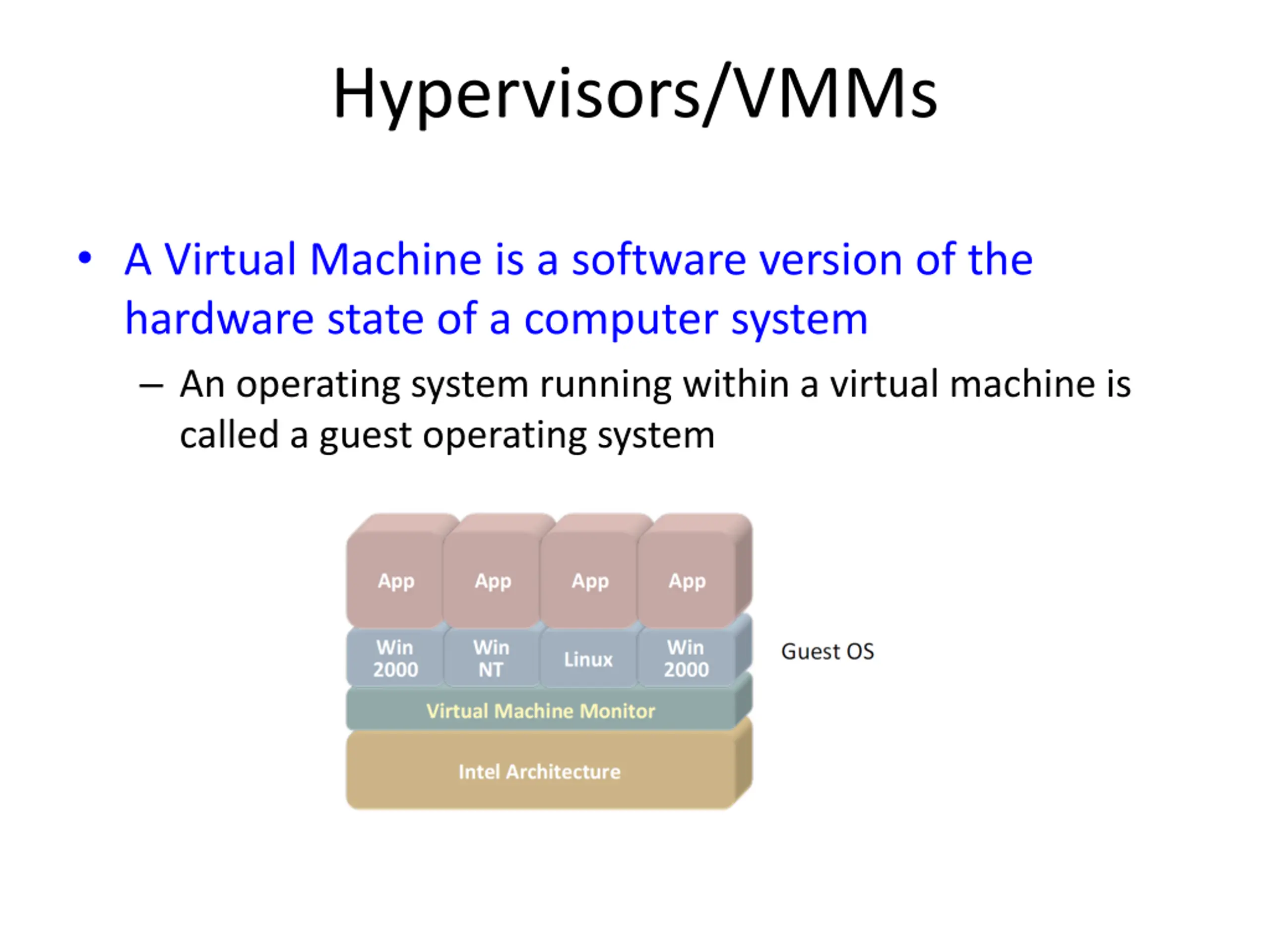 Hypervisors/VMMs A Virtual Machine is a software version of the hardware state of a computer system An operating system running within a virtual machine is called a guest operating system