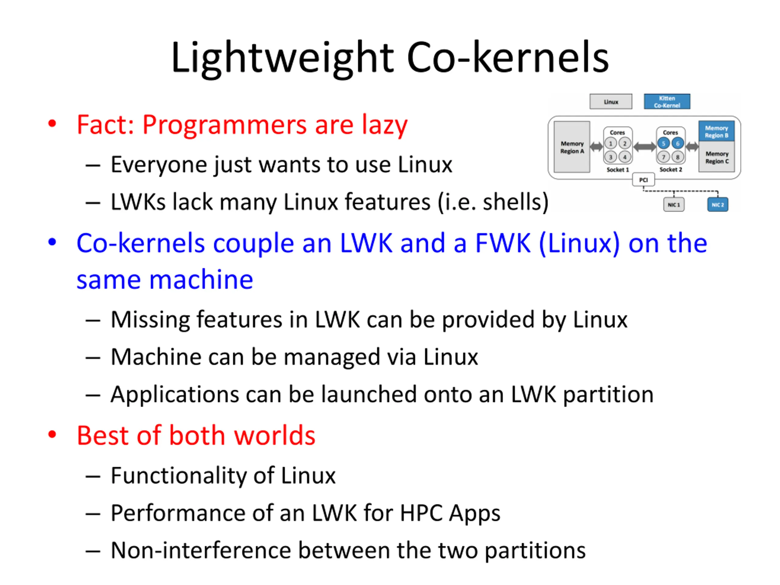 Lightweight Co-kernels Fact: Programmers are lazy Everyone just wants to use Linux LWKs lack many Linux features (i.e. shells) Co-kernels couple an LWK and a FWK (Linux) on the same machine Missing features in LWK can be provided by Linux Machine can be managed via Linux Applications can be launched onto an LWK partition Best of both worlds Functionality of Linux Performance of an LWK for HPC Apps Non-interference between the two partitions