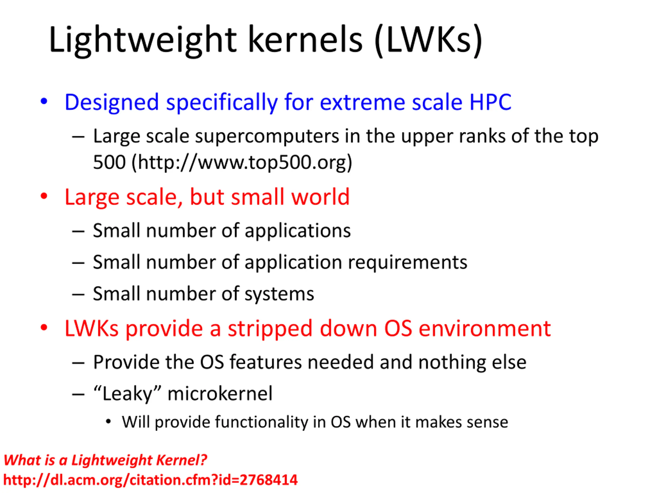 Lightweight kernels (LWKs) Designed specifically for extreme scale HPC Large scale supercomputers in the upper ranks of the top 500 (http://www.top500.org) Large scale, but small world Small number of applications Small number of application requirements Small number of systems LWKs provide a stripped down OS environment Provide the OS features needed and nothing else Leaky microkernel Will provide functionality in OS when it makes sense What is a Lightweight Kernel? http://dl.acm.org/citation.cfm?id=2768414