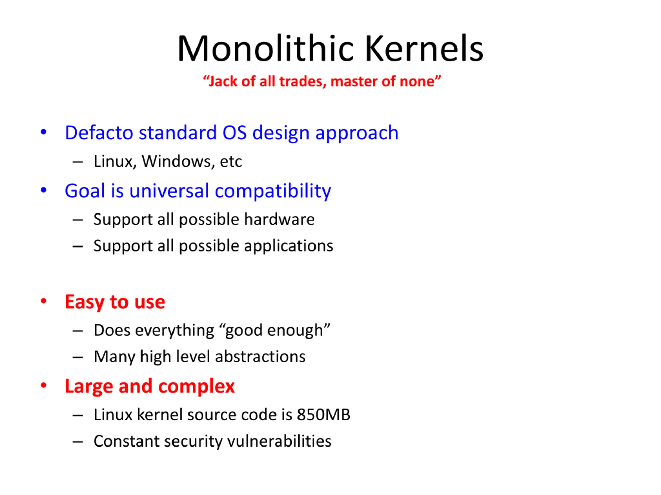 Monolithic Kernels Jack of all trades, master of none Defacto standard OS design approach Linux, Windows, etc Goal is universal compatibility Support all possible hardware Support all possible applications Easy to use Does everything good enough Many high level abstractions Large and complex Linux kernel source code is 850MB Constant security vulnerabilities