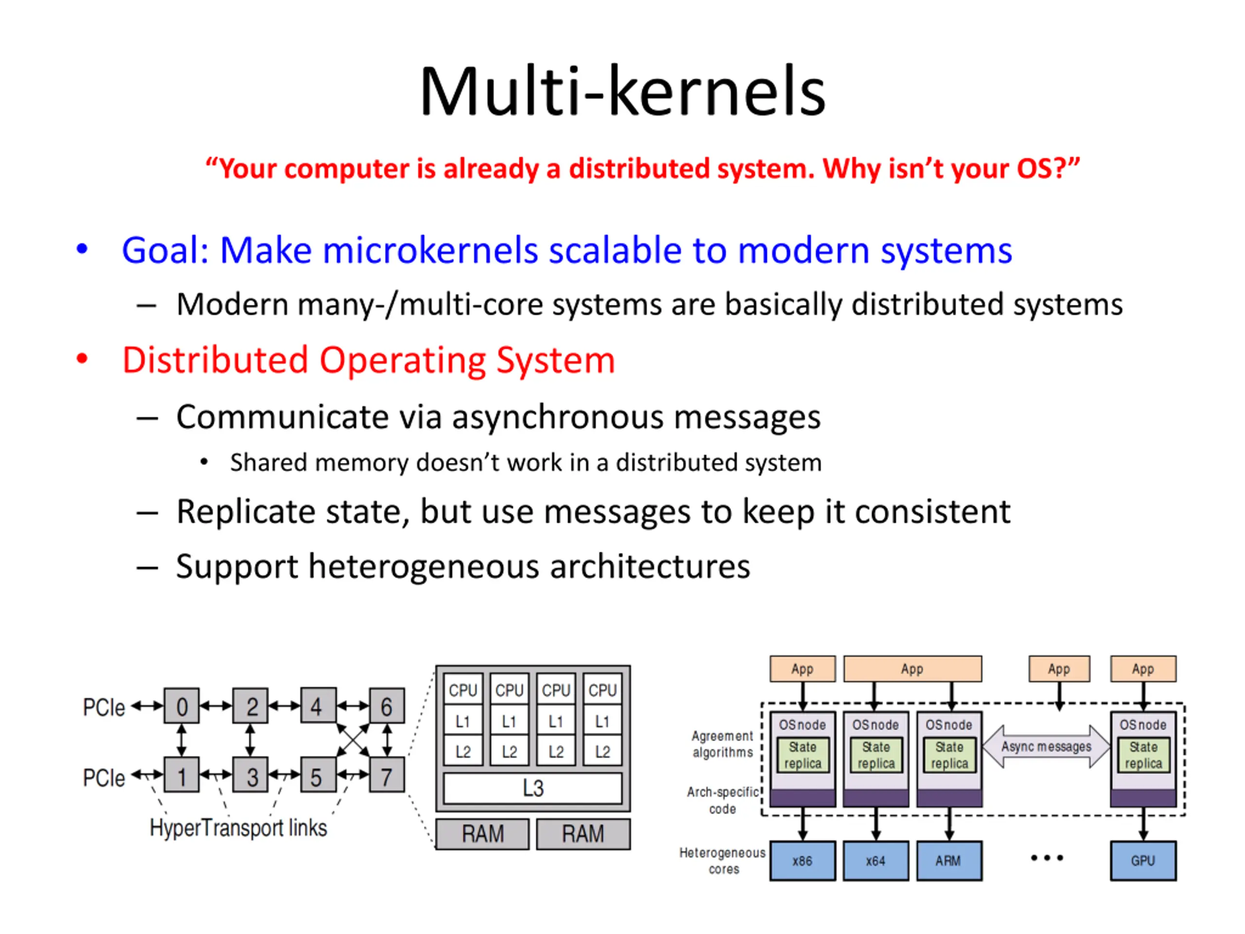 Multi-kernels Your computer is already a distributed system. Why isn t your OS? Goal: Make microkernels scalable to modern systems Modern many-/multi-core systems are basically distributed systems Distributed Operating System Communicate via asynchronous messages Shared memory doesn t work in a distributed system Replicate state, but use messages to keep it consistent Support heterogeneous architectures