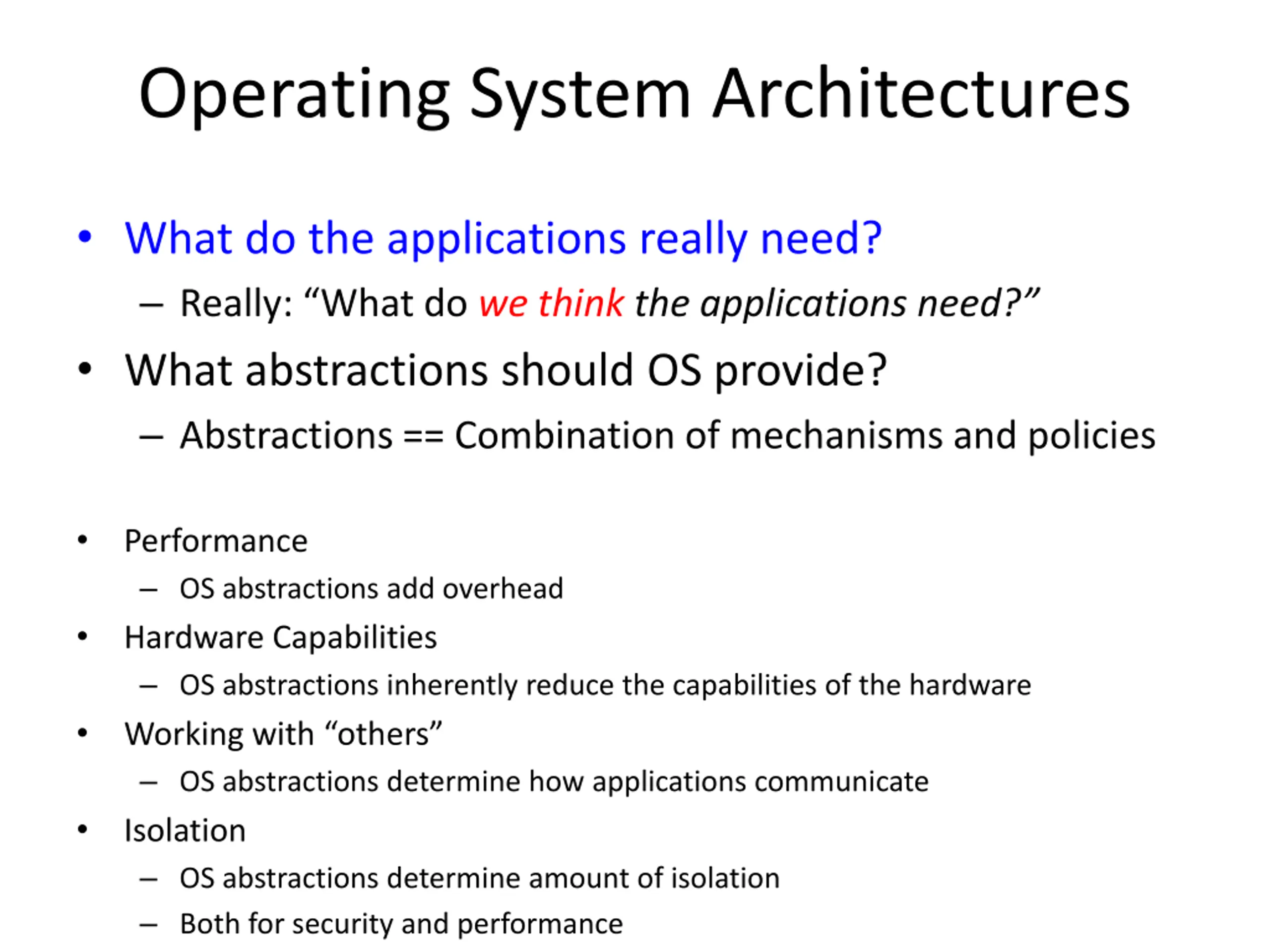 Operating System Architectures What do the applications really need? Really: What do we think the applications need? What abstractions should OS provide? Abstractions == Combination of mechanisms and policies Performance OS abstractions add overhead Hardware Capabilities OS abstractions inherently reduce the capabilities of the hardware Working with others OS abstractions determine how applications communicate Isolation OS abstractions determine amount of isolation Both for security and performance