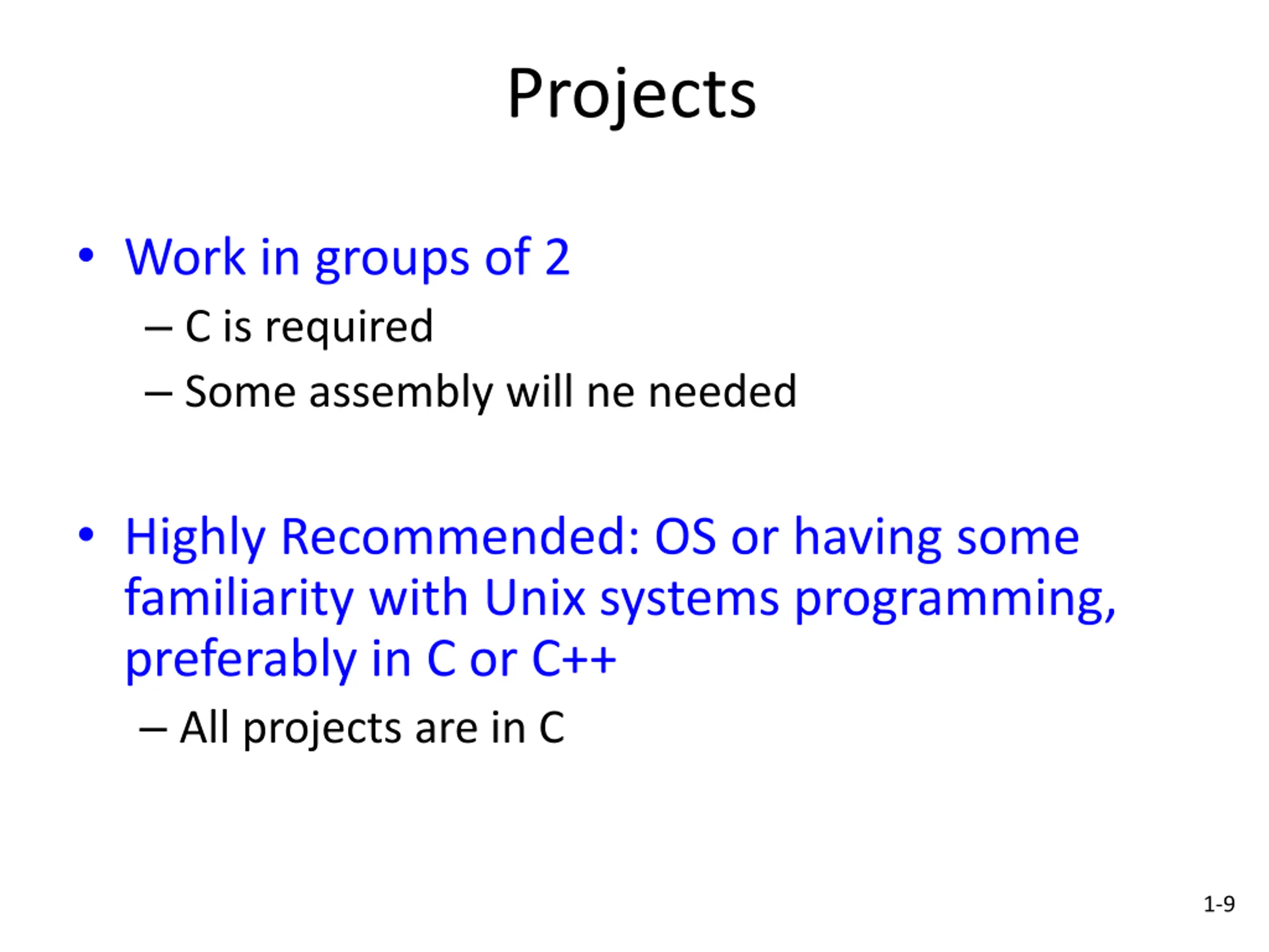 Projects Work in groups of 2 C is required Some assembly will ne needed Highly Recommended: OS or having some familiarity with Unix systems programming, preferably in C or C++ All projects are in C 1-9