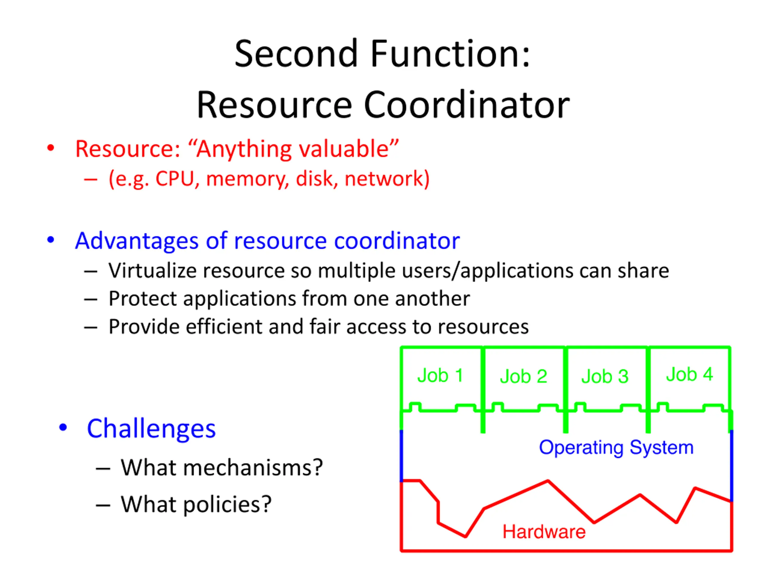 Second Function: Resource Coordinator Resource: Anything valuable (e.g. CPU, memory, disk, network) Advantages of resource coordinator Virtualize resource so multiple users/applications can share Protect applications from one another Provide efficient and fair access to resources Challenges What mechanisms? What policies?
