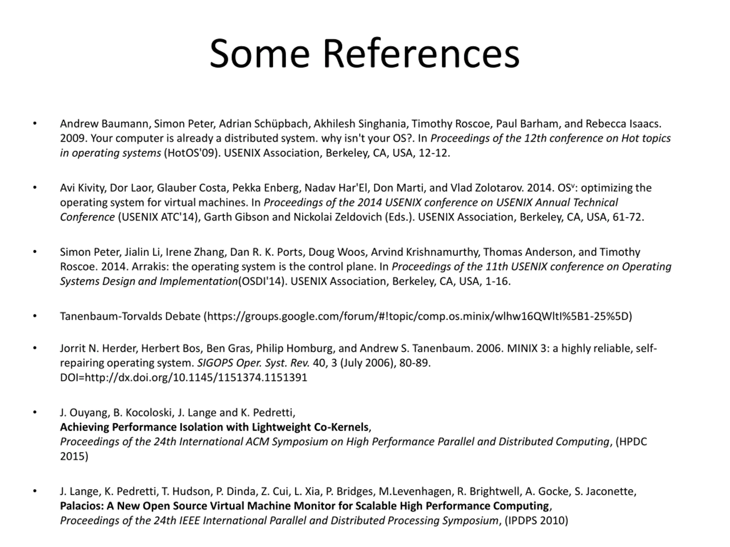 Some References Andrew Baumann, Simon Peter, Adrian Sch pbach, Akhilesh Singhania, Timothy Roscoe, Paul Barham, and Rebecca Isaacs. 2009. Your computer is already a distributed system. why isn't your OS?. In Proceedings of the 12th conference on Hot topics in operating systems (HotOS'09). USENIX Association, Berkeley, CA, USA, 12-12. Avi Kivity, Dor Laor, Glauber Costa, Pekka Enberg, Nadav Har'El, Don Marti, and Vlad Zolotarov. 2014. OSv: optimizing the operating system for virtual machines. In Proceedings of the 2014 USENIX conference on USENIX Annual Technical Conference (USENIX ATC'14), Garth Gibson and Nickolai Zeldovich (Eds.). USENIX Association, Berkeley, CA, USA, 61-72. Simon Peter, Jialin Li, Irene Zhang, Dan R. K. Ports, Doug Woos, Arvind Krishnamurthy, Thomas Anderson, and Timothy Roscoe. 2014. Arrakis: the operating system is the control plane. In Proceedings of the 11th USENIX conference on Operating Systems Design and Implementation(OSDI'14). USENIX Association, Berkeley, CA, USA, 1-16. Tanenbaum-Torvalds Debate (https://groups.google.com/forum/#!topic/comp.os.minix/wlhw16QWltI%5B1-25%5D) Jorrit N. Herder, Herbert Bos, Ben Gras, Philip Homburg, and Andrew S. Tanenbaum. 2006. MINIX 3: a highly reliable, self- repairing operating system. SIGOPS Oper. Syst. Rev. 40, 3 (July 2006), 80-89. DOI=http://dx.doi.org/10.1145/1151374.1151391 J. Ouyang, B. Kocoloski, J. Lange and K. Pedretti, Achieving Performance Isolation with Lightweight Co-Kernels, Proceedings of the 24th International ACM Symposium on High Performance Parallel and Distributed Computing, (HPDC 2015) J. Lange, K. Pedretti, T. Hudson, P. Dinda, Z. Cui, L. Xia, P. Bridges, M.Levenhagen, R. Brightwell, A. Gocke, S. Jaconette, Palacios: A New Open Source Virtual Machine Monitor for Scalable High Performance Computing, Proceedings of the 24th IEEE International Parallel and Distributed Processing Symposium, (IPDPS 2010)