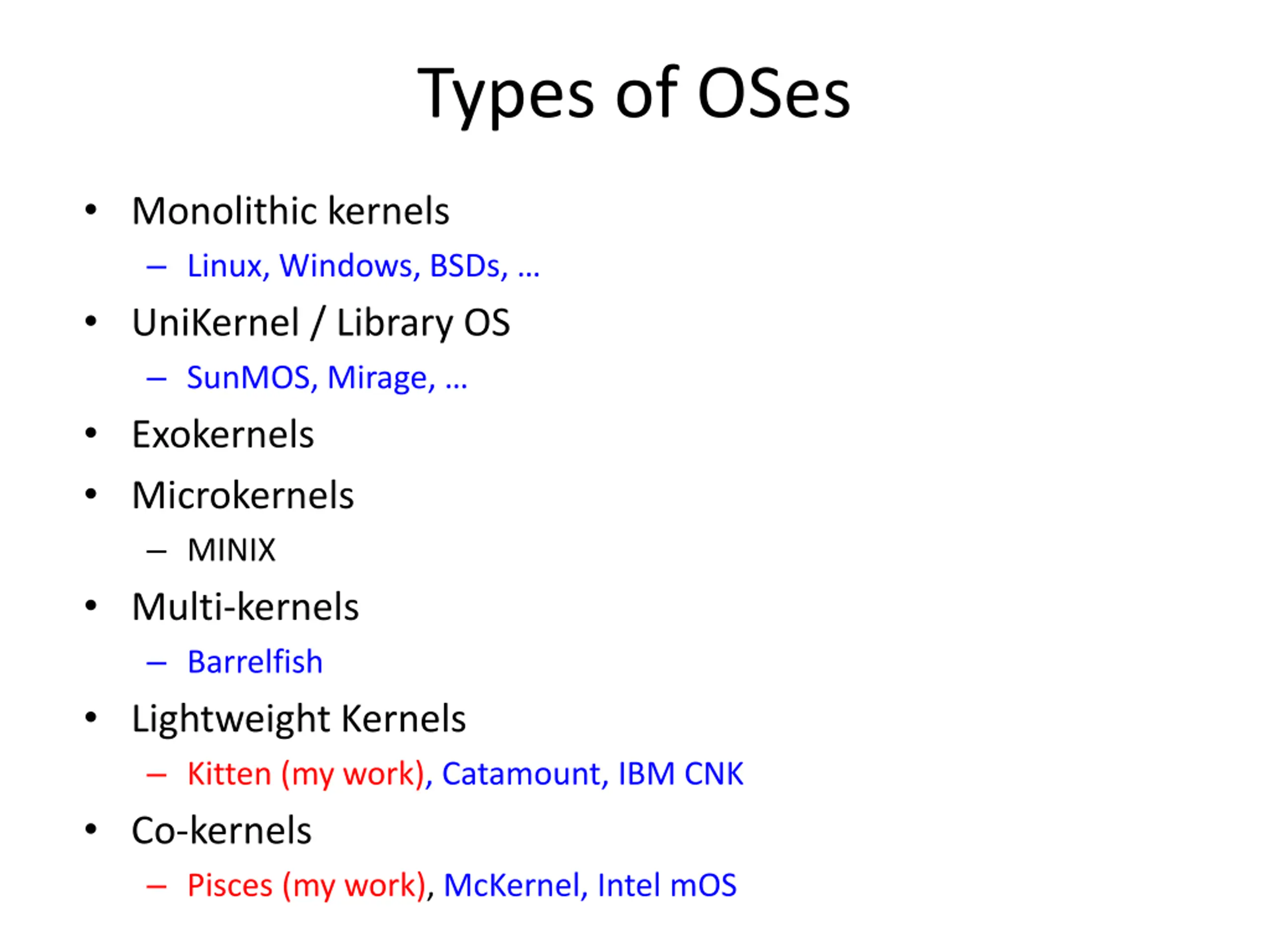 Types of OSes Monolithic kernels Linux, Windows, BSDs, UniKernel / Library OS SunMOS, Mirage, Exokernels Microkernels MINIX Multi-kernels Barrelfish Lightweight Kernels Kitten (my work), Catamount, IBM CNK Co-kernels Pisces (my work), McKernel, Intel mOS
