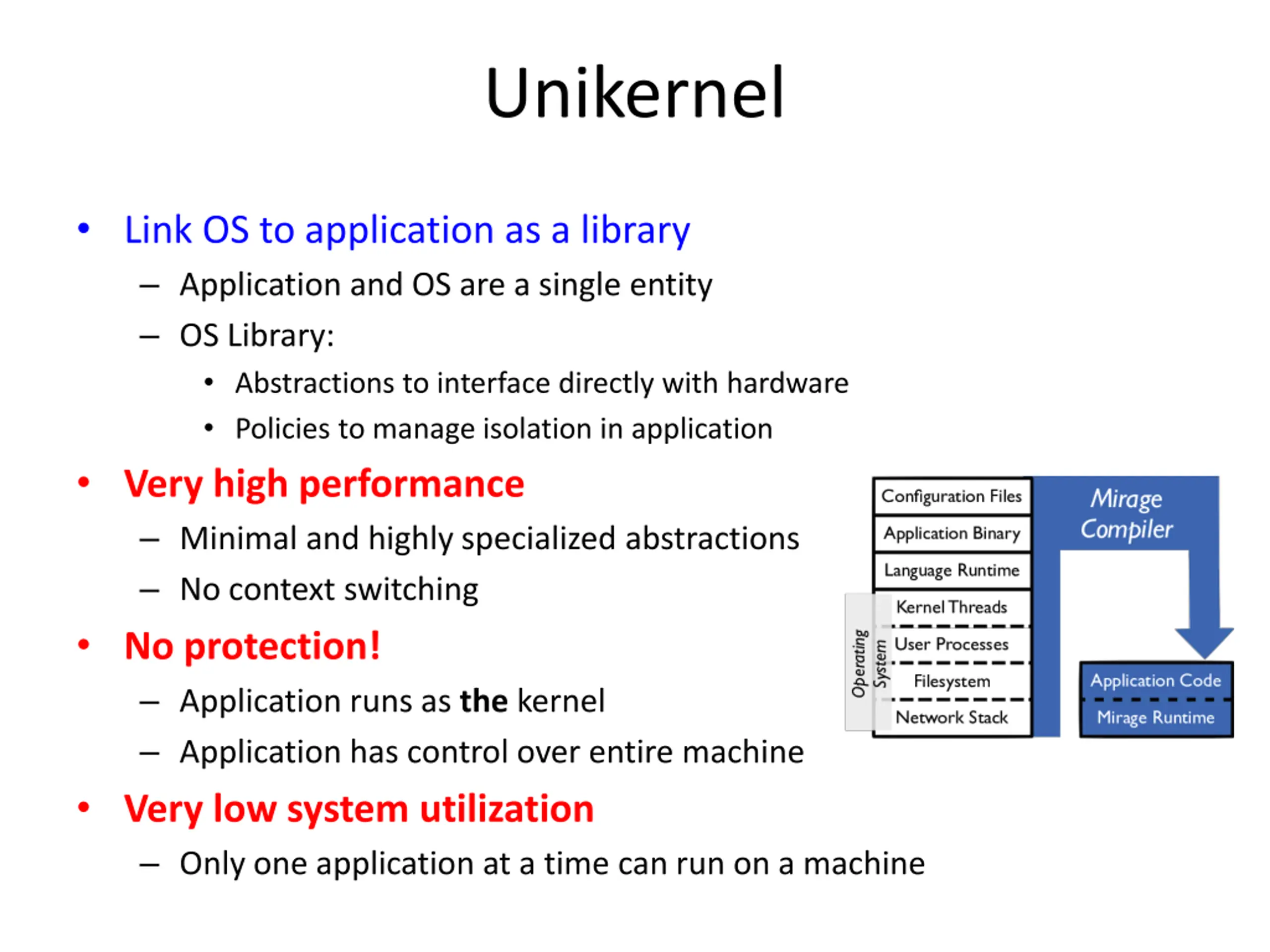 Unikernel Link OS to application as a library Application and OS are a single entity OS Library: Abstractions to interface directly with hardware Policies to manage isolation in application Very high performance Minimal and highly specialized abstractions No context switching No protection! Application runs as the kernel Application has control over entire machine Very low system utilization Only one application at a time can run on a machine