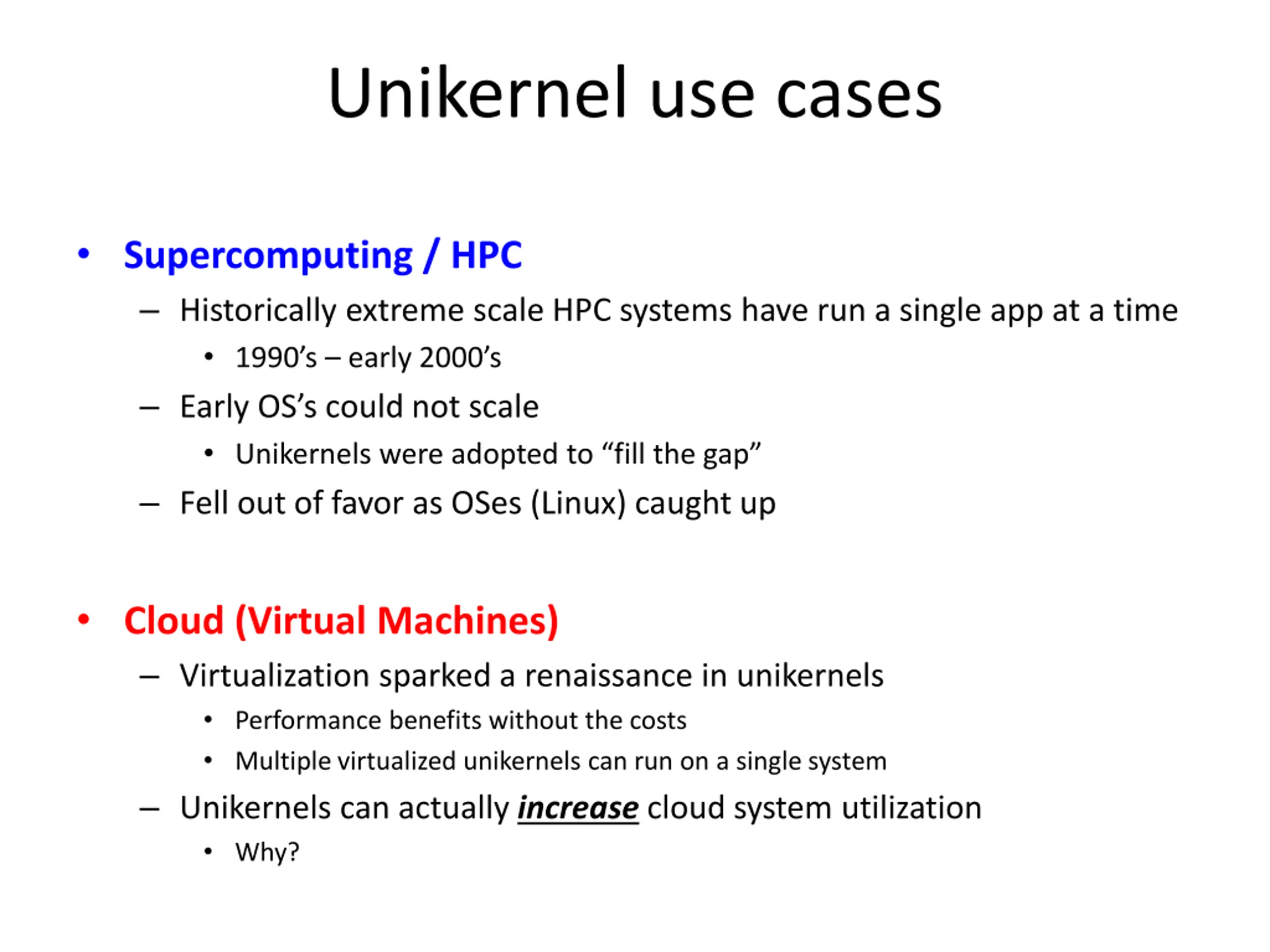 Unikernel use cases Supercomputing / HPC Historically extreme scale HPC systems have run a single app at a time 1990 s early 2000 s Early OS s could not scale Unikernels were adopted to fill the gap Fell out of favor as OSes (Linux) caught up Cloud (Virtual Machines) Virtualization sparked a renaissance in unikernels Performance benefits without the costs Multiple virtualized unikernels can run on a single system Unikernels can actually increase cloud system utilization Why?