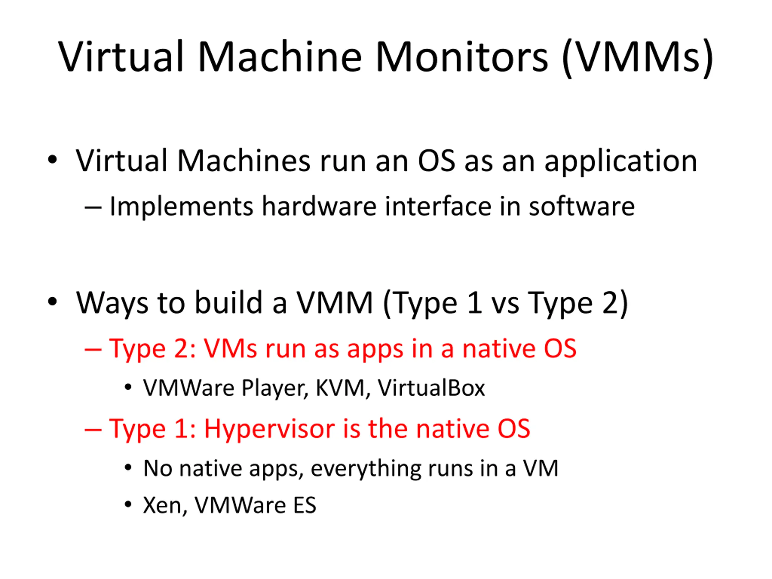 Virtual Machine Monitors (VMMs) Virtual Machines run an OS as an application Implements hardware interface in software Ways to build a VMM (Type 1 vs Type 2) Type 2: VMs run as apps in a native OS VMWare Player, KVM, VirtualBox Type 1: Hypervisor is the native OS No native apps, everything runs in a VM Xen, VMWare ES