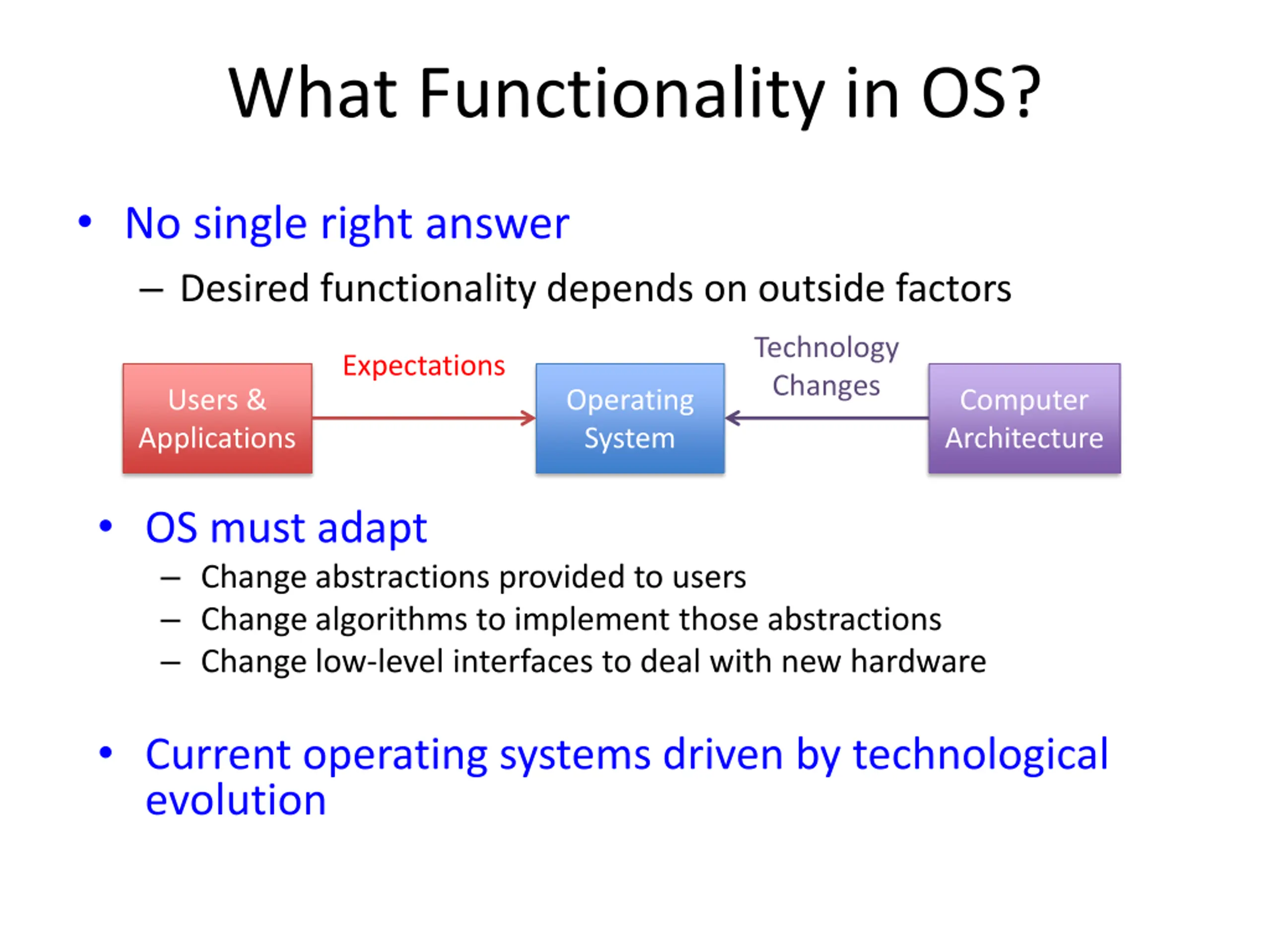 What Functionality in OS? No single right answer Desired functionality depends on outside factors Technology Changes Expectations Users & Applications Operating System Computer Architecture OS must adapt Change abstractions provided to users Change algorithms to implement those abstractions Change low-level interfaces to deal with new hardware Current operating systems driven by technological evolution
