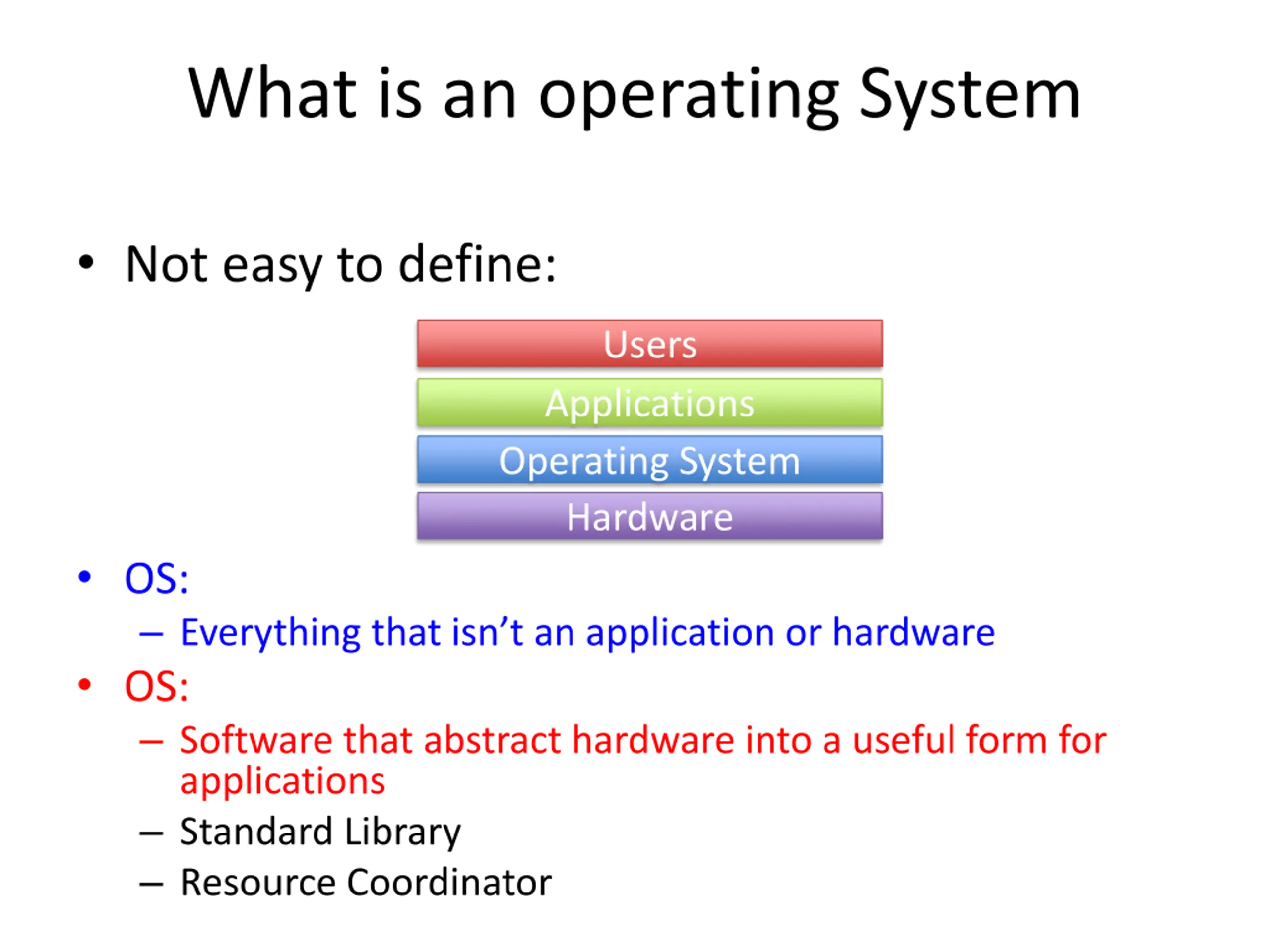 What is an operating System Not easy to define: Users Applications Operating System Hardware OS: Everything that isn t an application or hardware OS: Software that abstract hardware into a useful form for applications Standard Library Resource Coordinator