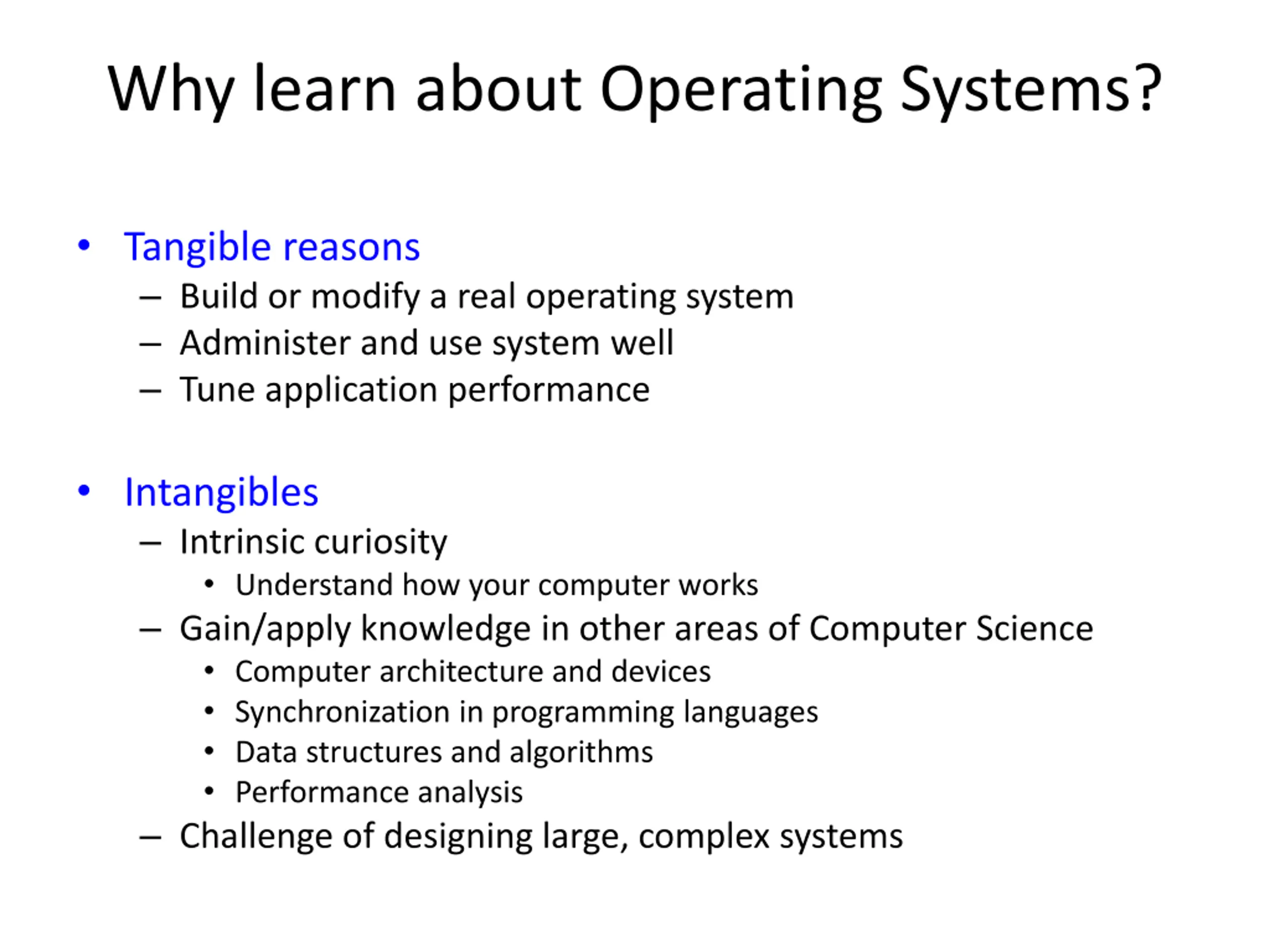Why learn about Operating Systems? Tangible reasons Build or modify a real operating system Administer and use system well Tune application performance Intangibles Intrinsic curiosity Understand how your computer works Gain/apply knowledge in other areas of Computer Science Computer architecture and devices Synchronization in programming languages Data structures and algorithms Performance analysis Challenge of designing large, complex systems