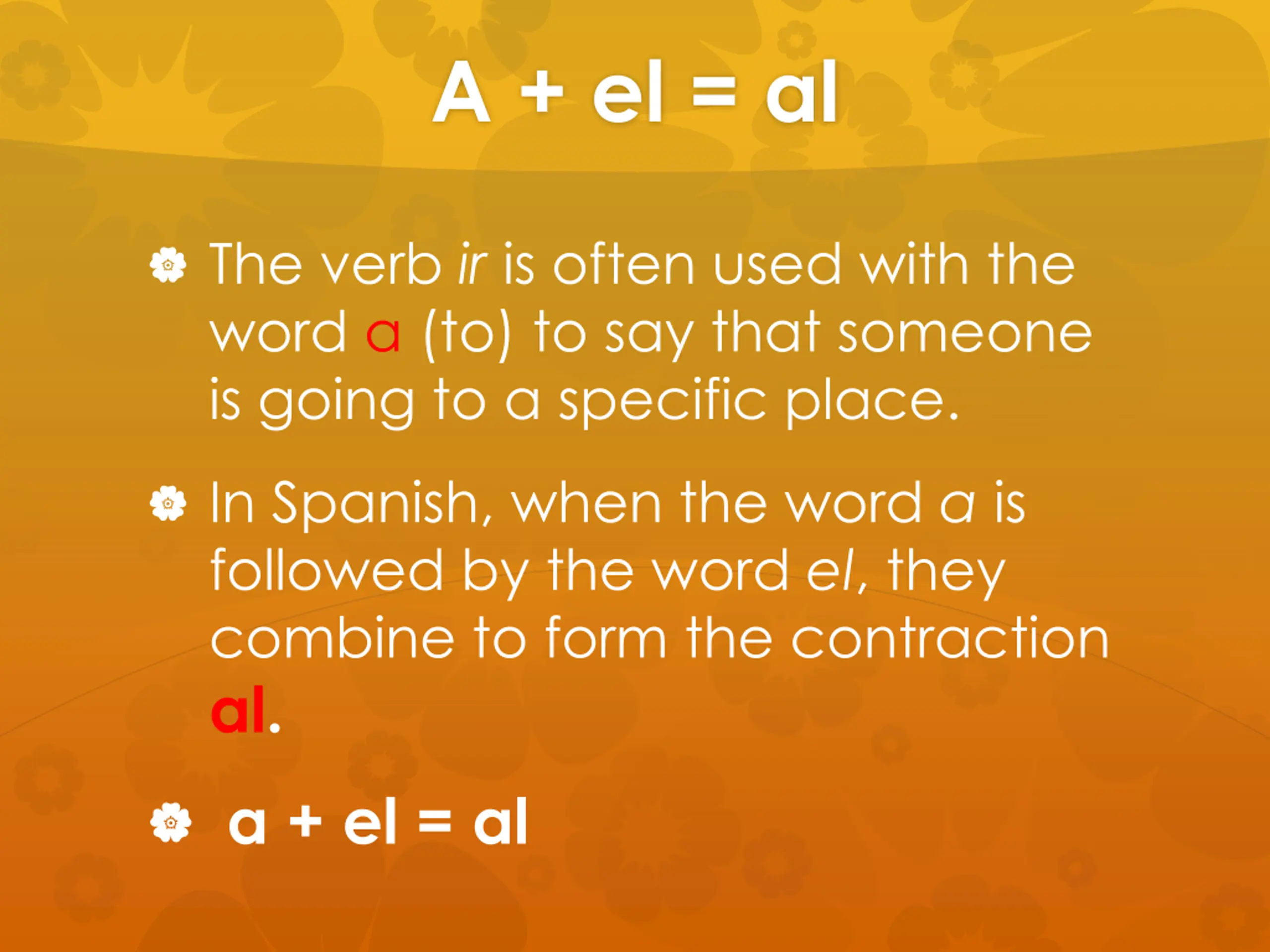 - A + el = al The verb ir is often used with the word a (to) to say that someone is going to a specific place. In Spanish, when the word a is followed by the word el, they combine to form the contraction al. a + el = al