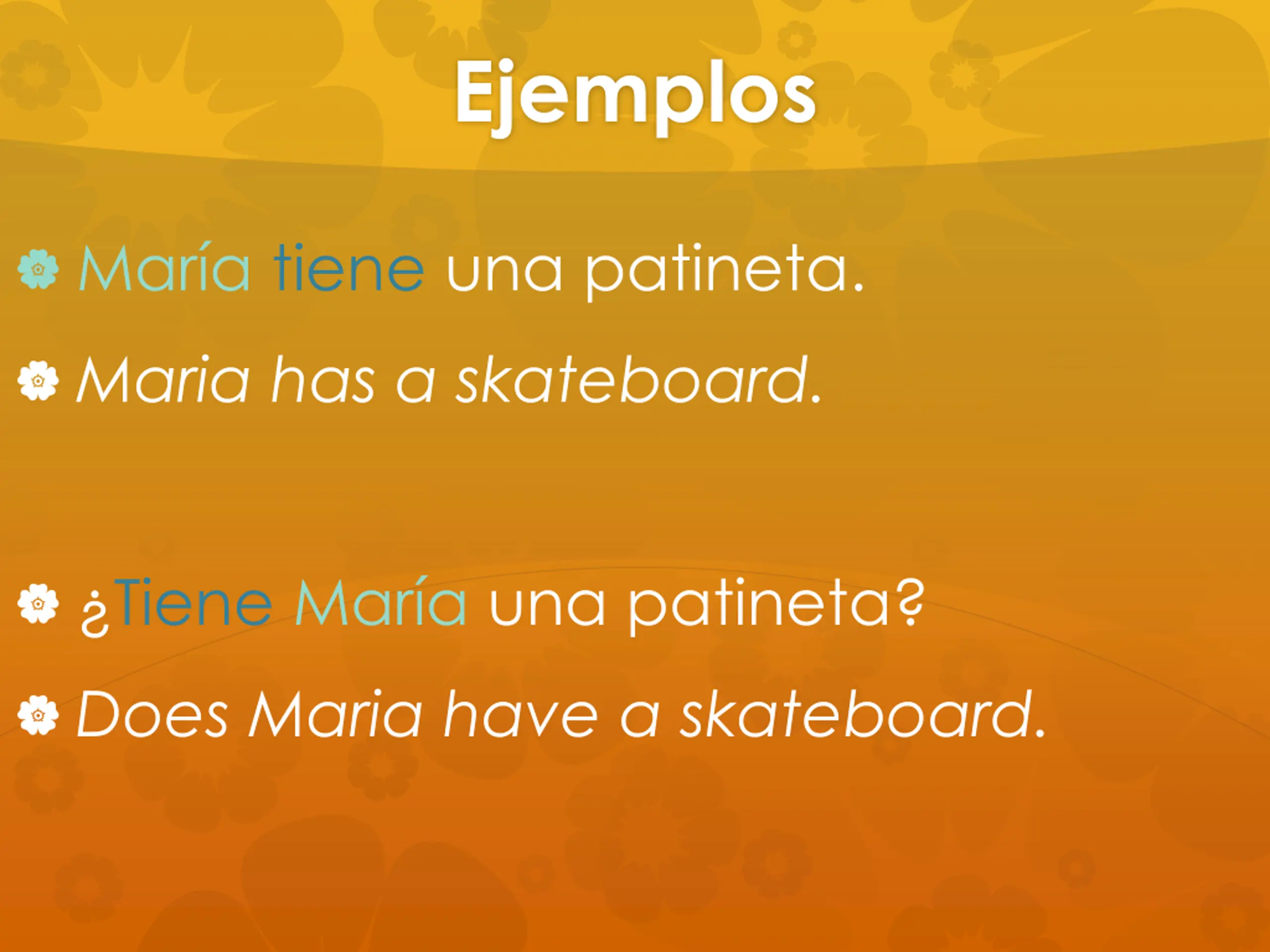 - Ejemplos Mar a tiene una patineta. Maria has a skateboard. Tiene Mar a una patineta? Does Maria have a skateboard.