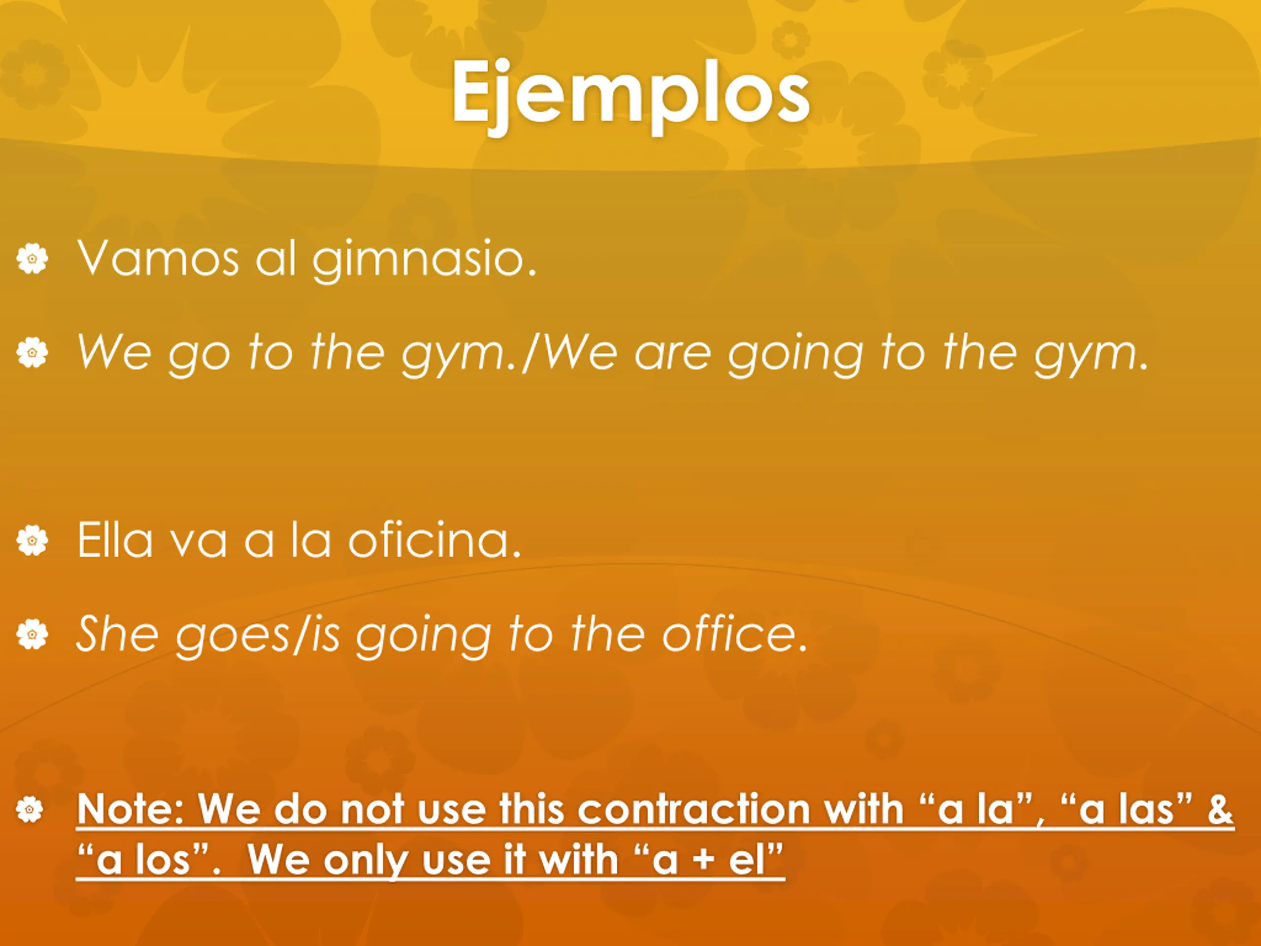 - Ejemplos Vamos al gimnasio. We go to the gym./We are going to the gym. Ella va a la oficina. She goes/is going to the office. Note: We do not use this contraction with a la , a las & a los . We only use it with a + el