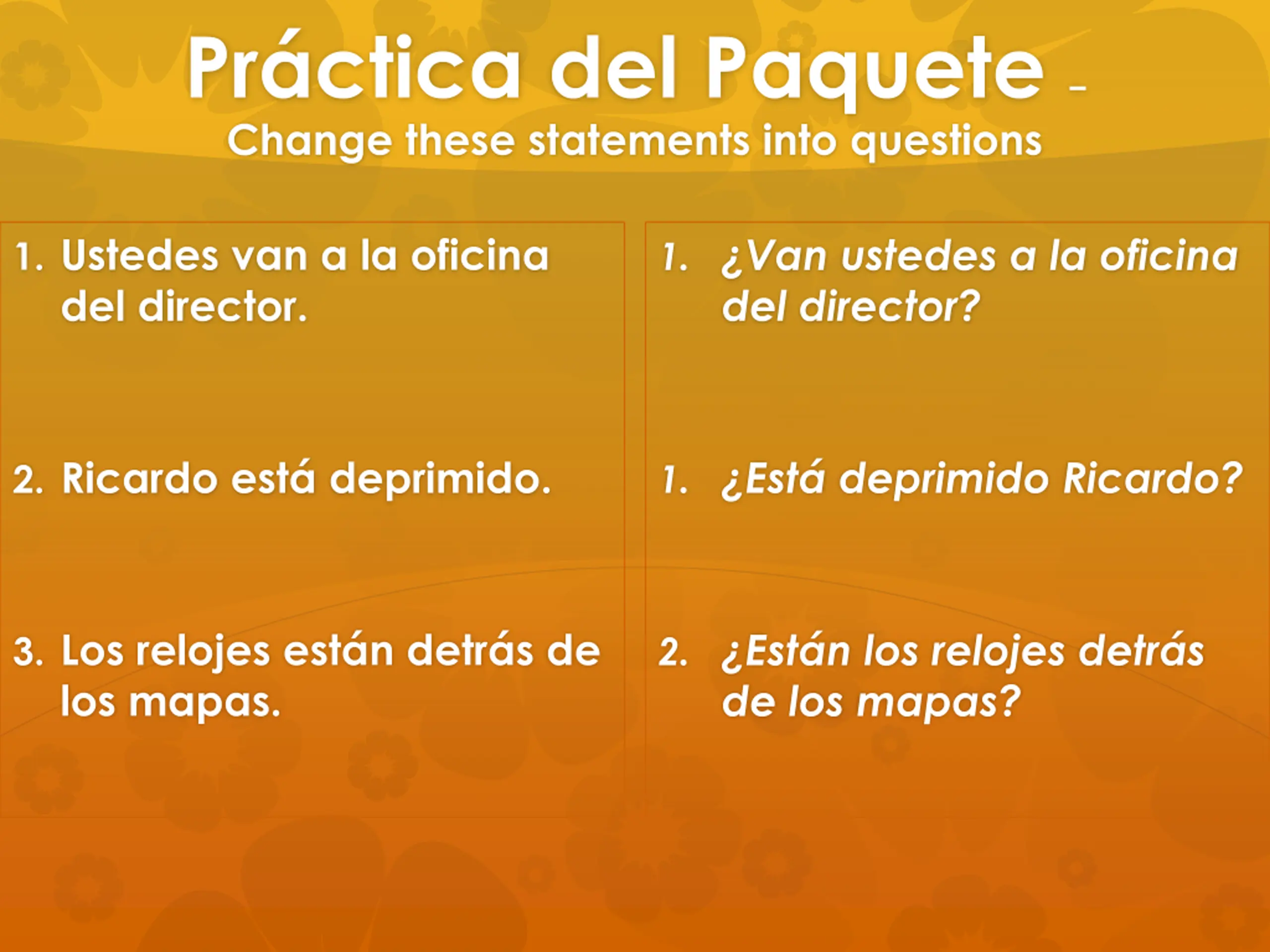 - Prctica del Paquete Change these statements into questions 1. Ustedes van a la oficina del director. 1. Van ustedes a la oficina del director? 2. Ricardo est deprimido. 1. Est deprimido Ricardo? 3. Los relojes est n detr s de los mapas. 2. Est n los relojes detr s de los mapas?