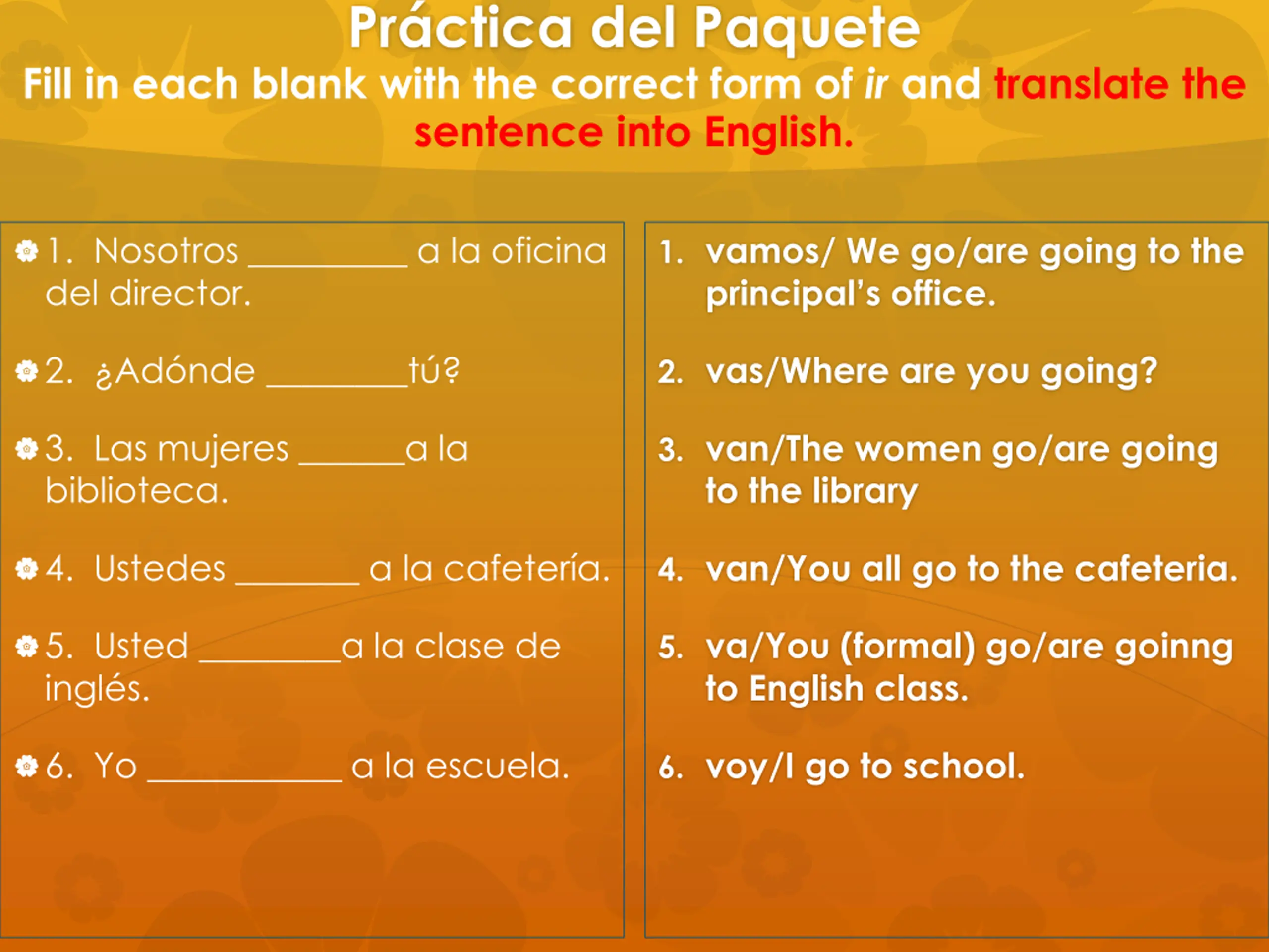 - Prctica del Paquete Fill in each blank with the correct form of ir and translate the sentence into English. 1. Nosotros _________ a la oficina del director. 1. vamos/ We go/are going to the principal s office. 2. Ad nde ________t ? 2. vas/Where are you going? 3. Las mujeres ______a la biblioteca. 3. van/The women go/are going to the library 4. Ustedes _______ a la cafeter a. 4. van/You all go to the cafeteria. 5. Usted ________a la clase de ingl s. 5. va/You (formal) go/are goinng to English class. 6. Yo ___________ a la escuela. 6. voy/I go to school.