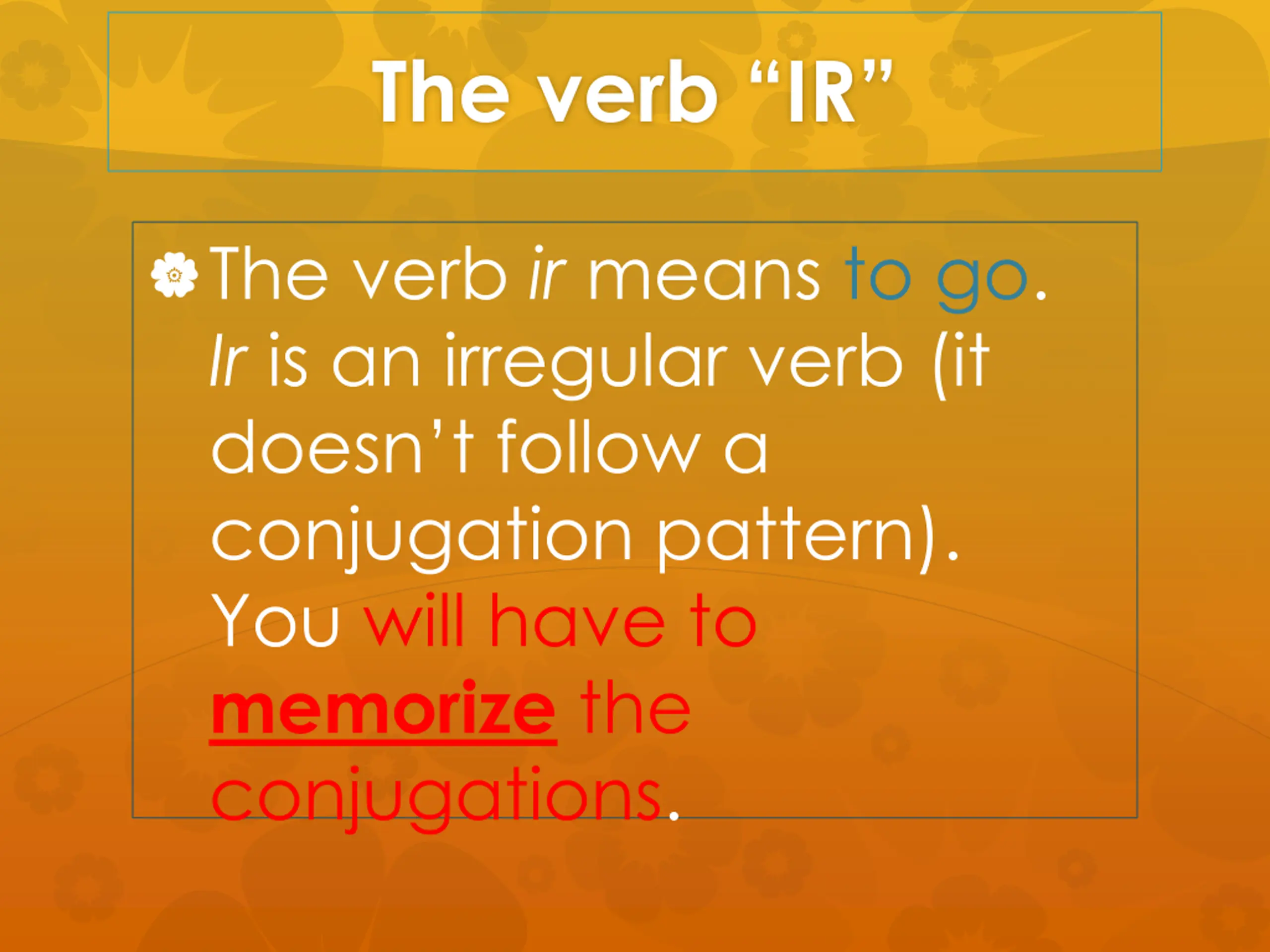- The verb IR The verb ir means to go. Ir is an irregular verb (it doesn t follow a conjugation pattern). You will have to memorize the conjugations.