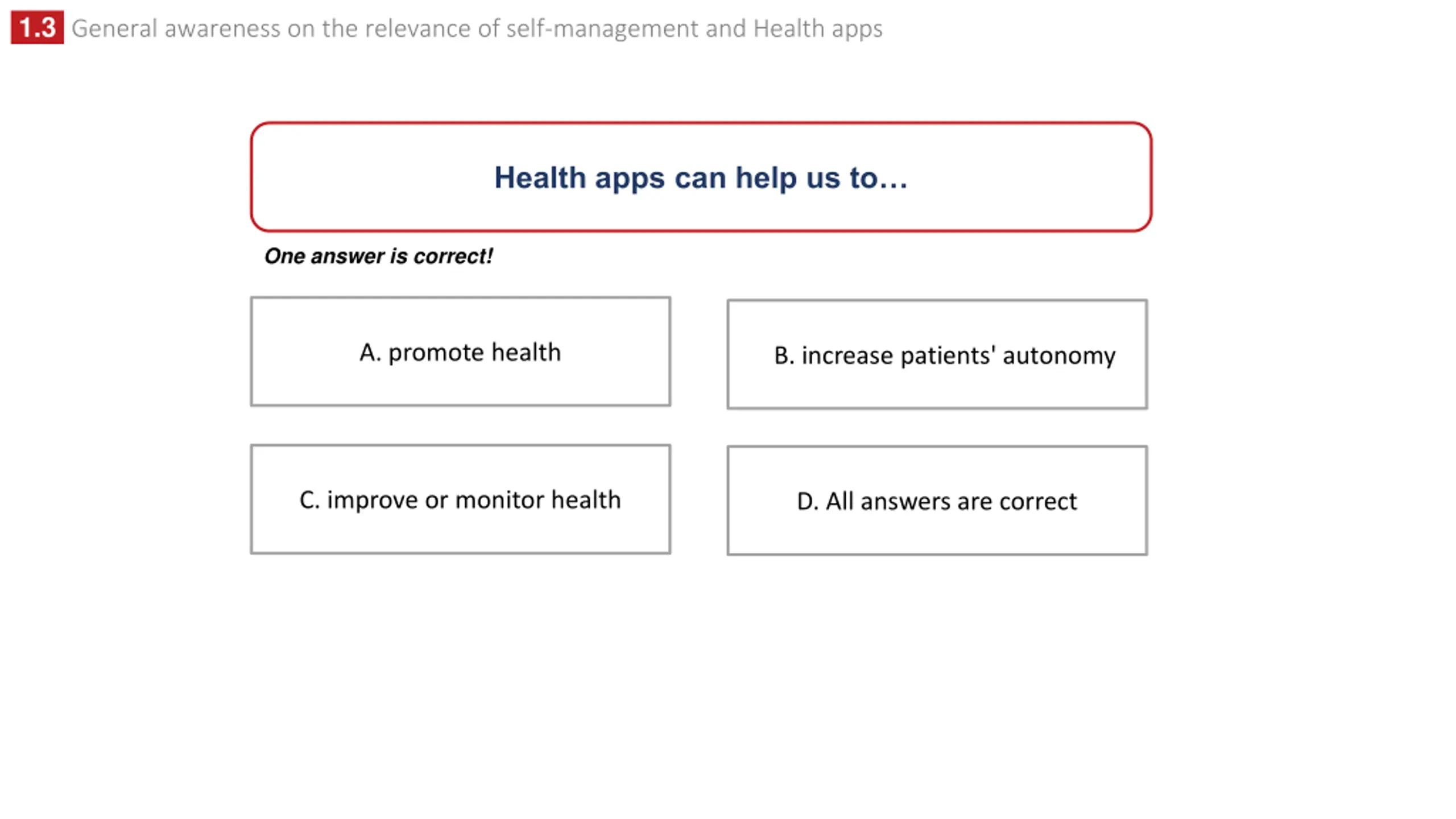 1.3 General awareness on the relevance of self-management and Health apps Health apps can help us to One answer is correct! A. promote health B. increase patients' autonomy C. improve or monitor health D. All answers are correct