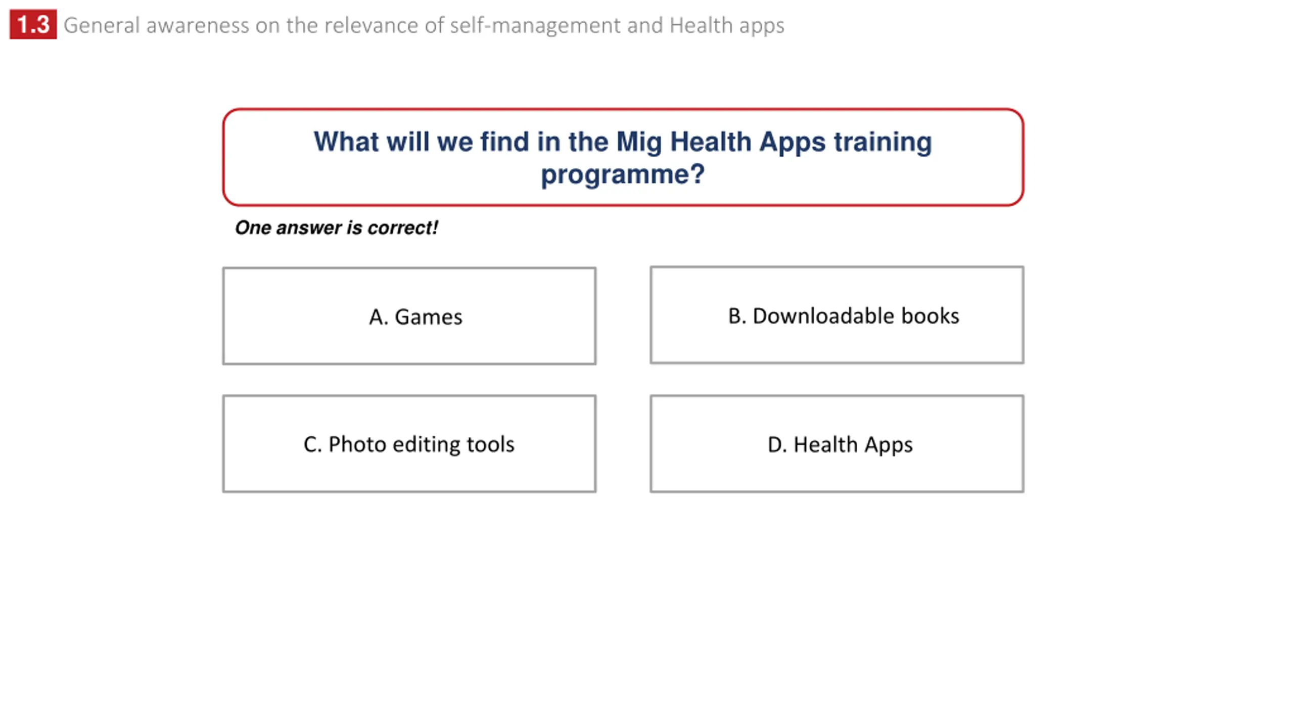 1.3 General awareness on the relevance of self-management and Health apps What will we find in the Mig Health Apps training programme? One answer is correct! B. Downloadable books A. Games C. Photo editing tools D. Health Apps