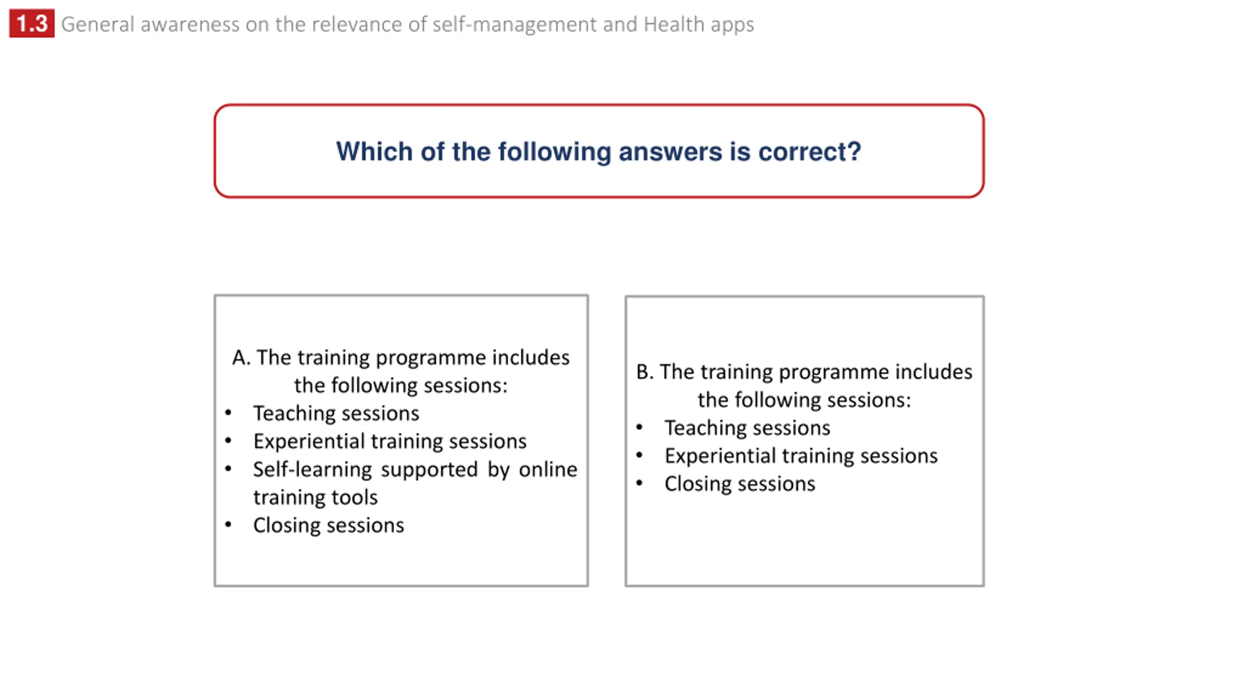 1.3 General awareness on the relevance of self-management and Health apps Which of the following answers is correct? A. The training programme includes the following sessions: Teaching sessions Experiential training sessions Self-learning supported by online training tools Closing sessions B. The training programme includes the following sessions: Teaching sessions Experiential training sessions Closing sessions