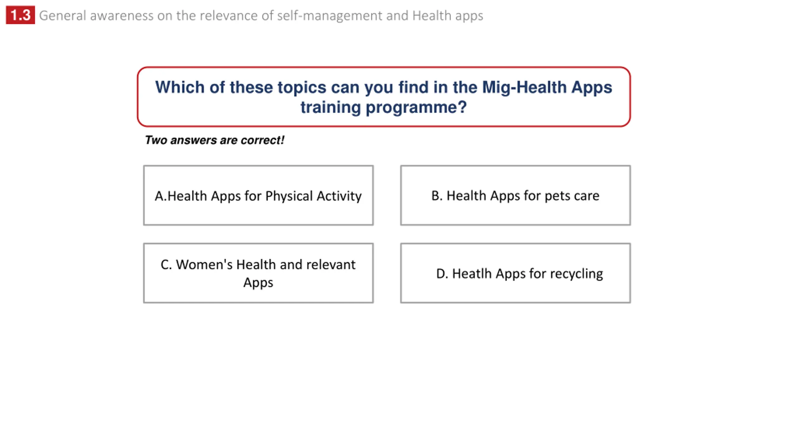 1.3 General awareness on the relevance of self-management and Health apps Which of these topics can you find in the Mig-Health Apps training programme? Two answers are correct! B. Health Apps for pets care A.Health Apps for Physical Activity C. Women's Health and relevant Apps D. Heatlh Apps for recycling