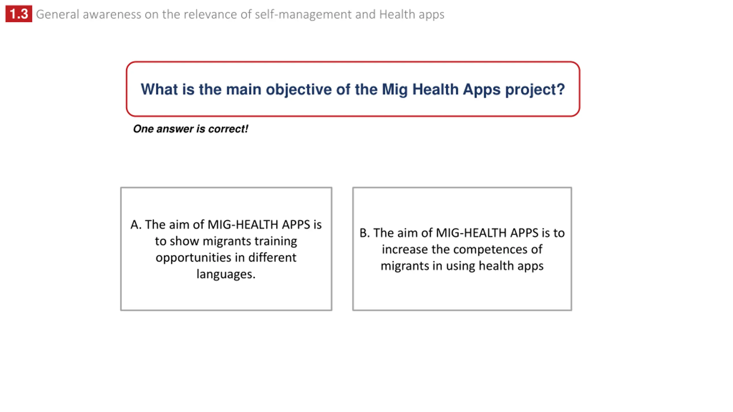 1.3 General awareness on the relevance of self-management and Health apps What is the main objective of the Mig Health Apps project? One answer is correct! A. The aim of MIG-HEALTH APPS is to show migrants training opportunities in different languages. B. The aim of MIG-HEALTH APPS is to increase the competences of migrants in using health apps