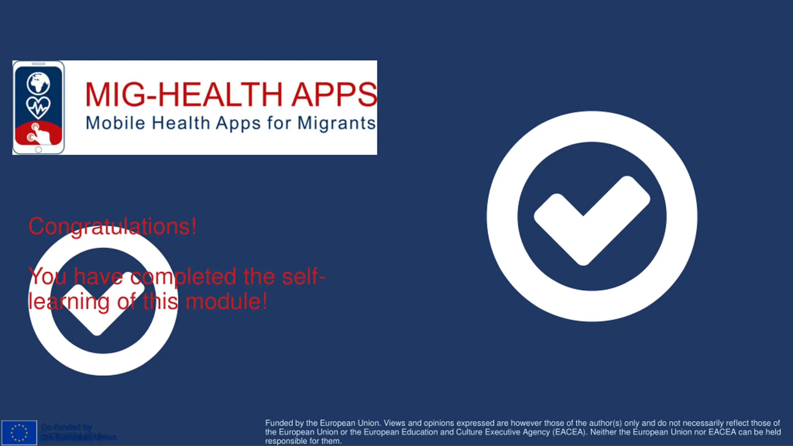 Congratulations! You have completed the self- learning of this module! Funded by the European Union. Views and opinions expressed are however those of the author(s) only and do not necessarily reflect those of the European Union or the European Education and Culture Executive Agency (EACEA). Neither the European Union nor EACEA can be held responsible for them.