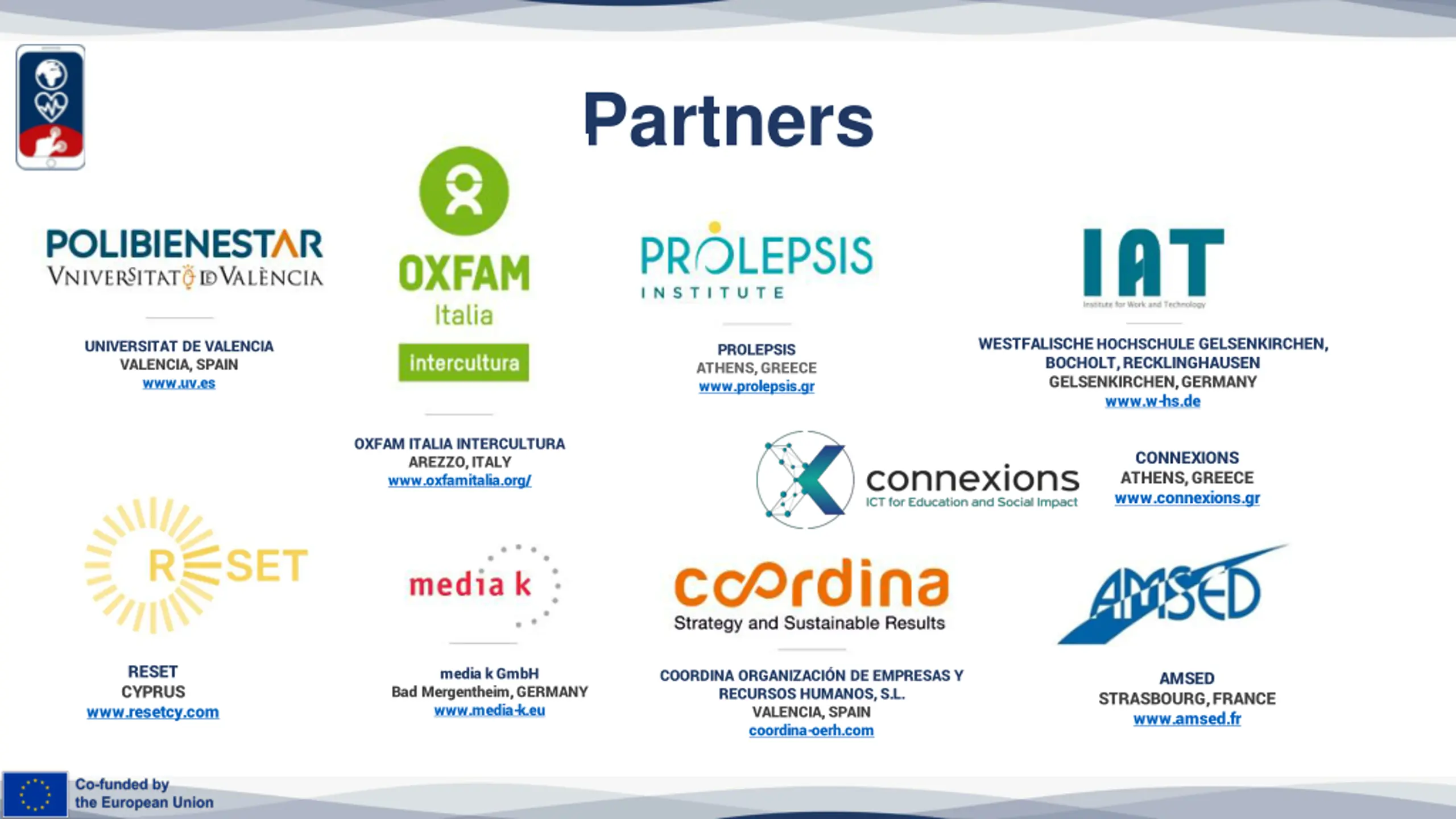 Partners 1. Prevent UNIVERSITAT DE VALENCIA VALENCIA, SPAIN www.uv.es WESTFALISCHE HOCHSCHULE GELSENKIRCHEN, BOCHOLT, RECKLINGHAUSEN GELSENKIRCHEN, GERMANY www.w-hs.de PROLEPSIS ATHENS, GREECE www.prolepsis.gr OXFAM ITALIA INTERCULTURA AREZZO, ITALY www.oxfamitalia.org/ CONNEXIONS ATHENS, GREECE www.connexions.gr 3. Participate 2. Empower RESET CYPRUS www.resetcy.com media k GmbH Bad Mergentheim, GERMANY www.media-k.eu COORDINA ORGANIZACI N DE EMPRESAS Y RECURSOS HUMANOS, S.L. VALENCIA, SPAIN coordina-oerh.com AMSED STRASBOURG, FRANCE www.amsed.fr