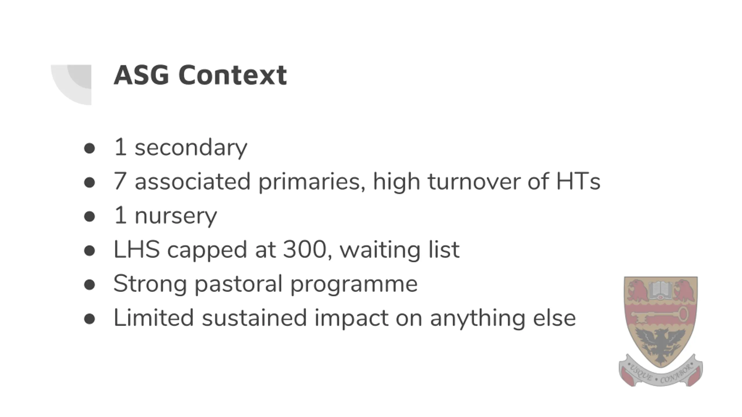 ASG Context 1 secondary 7 associated primaries, high turnover of HTs 1 nursery LHS capped at 300, waiting list Strong pastoral programme Limited sustained impact on anything else