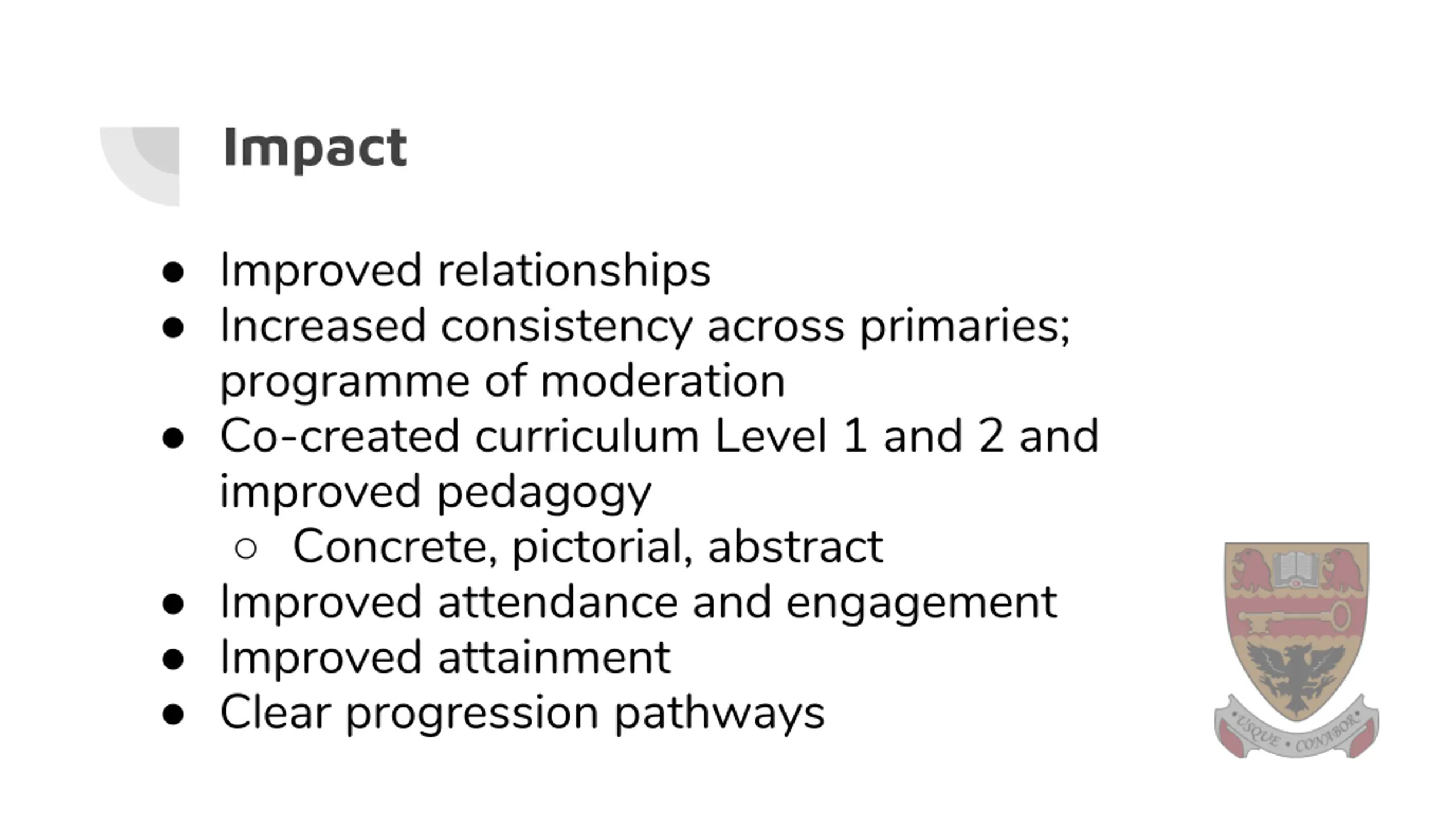 Impact Improved relationships Increased consistency across primaries; programme of moderation Co-created curriculum Level 1 and 2 and improved pedagogy Concrete, pictorial, abstract Improved attendance and engagement Improved attainment Clear progression pathways
