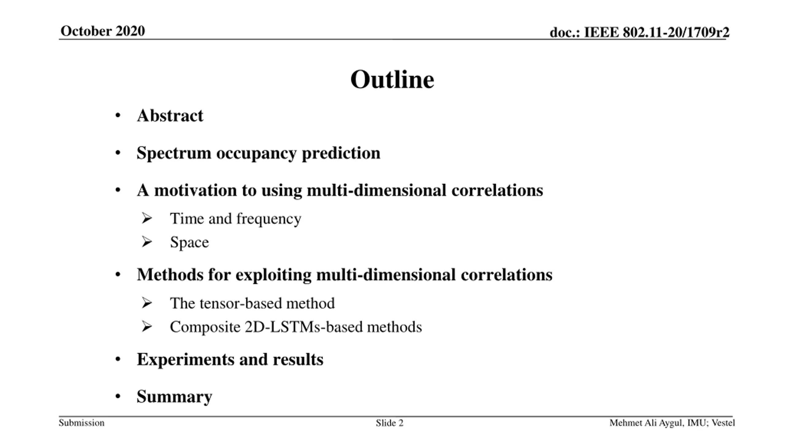 October 2020 doc.: IEEE 802.11-20/1709r2 Outline Abstract Spectrum occupancy prediction A motivation to using multi-dimensional correlations Time and frequency Space Methods for exploiting multi-dimensional correlations The tensor-based method Composite 2D-LSTMs-based methods Experiments and results Summary Submission Mehmet Ali Aygul, IMU; Vestel Slide 2