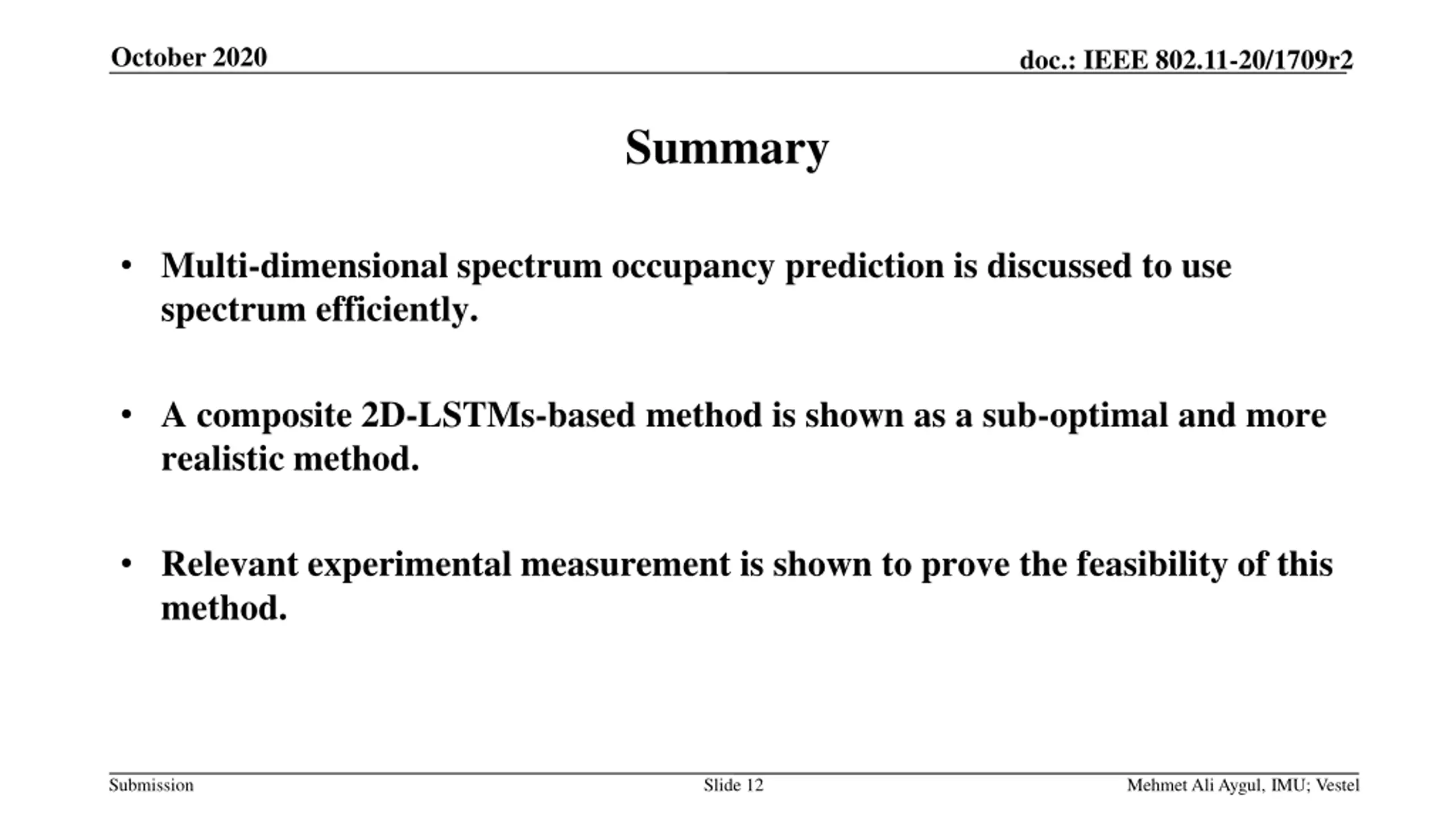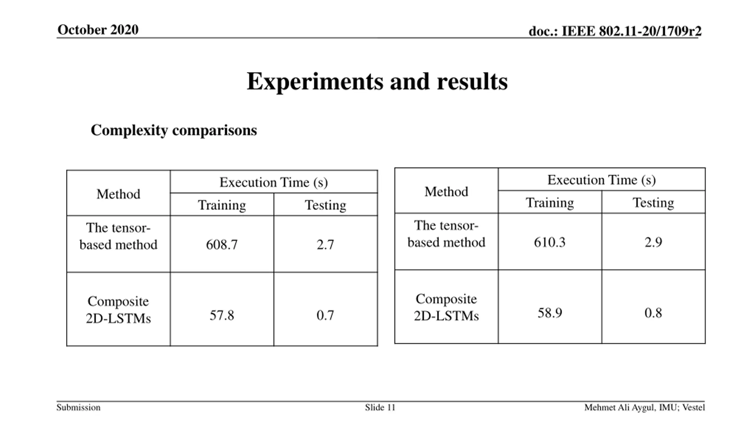 October 2020 doc.: IEEE 802.11-20/1709r2 Experiments and results Complexity comparisons Execution Time (s) Training Execution Time (s) Training Method Method Testing Testing The tensor- based method The tensor- based method 610.3 2.9 608.7 2.7 Composite 2D-LSTMs Composite 2D-LSTMs 58.9 0.8 57.8 0.7 Submission Slide 11 Mehmet Ali Aygul, IMU; Vestel