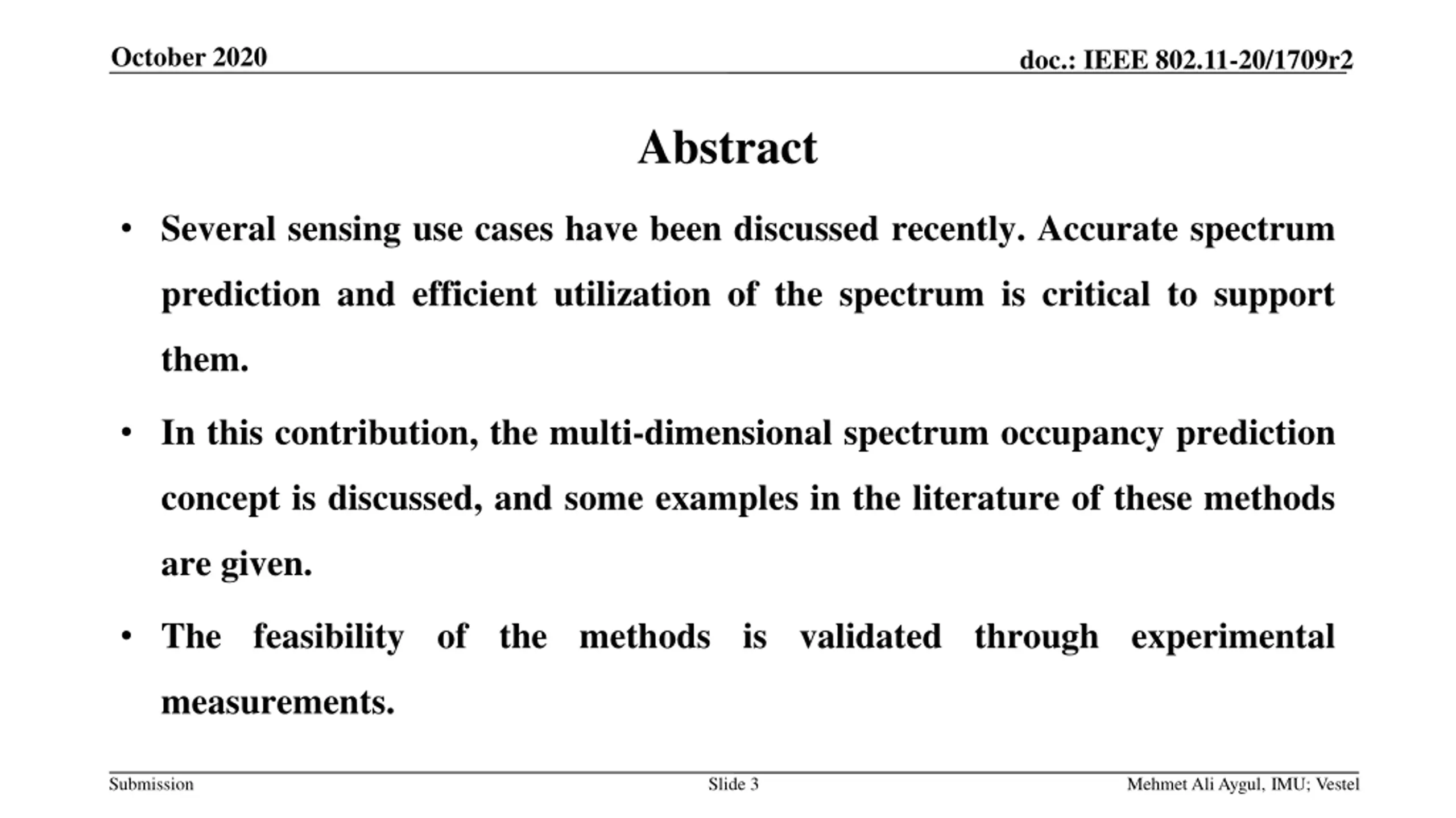 October 2020 doc.: IEEE 802.11-20/1709r2 Abstract Several sensing use cases have been discussed recently. Accurate spectrum prediction and efficient utilization of the spectrum is critical to support them. In this contribution, the multi-dimensional spectrum occupancy prediction concept is discussed, and some examples in the literature of these methods are given. The feasibility of the methods is validated through experimental measurements. Submission Slide 3 Mehmet Ali Aygul, IMU; Vestel